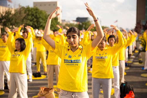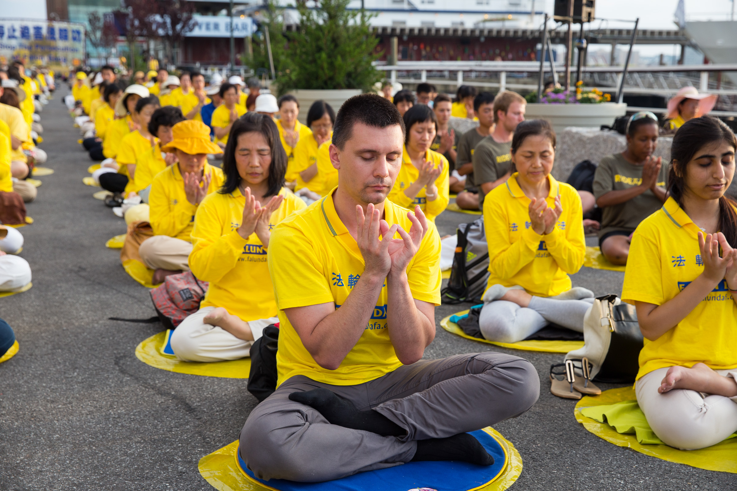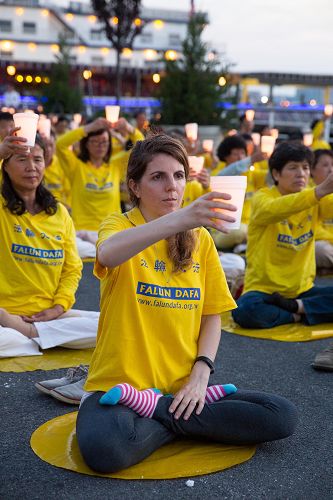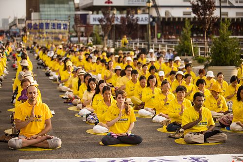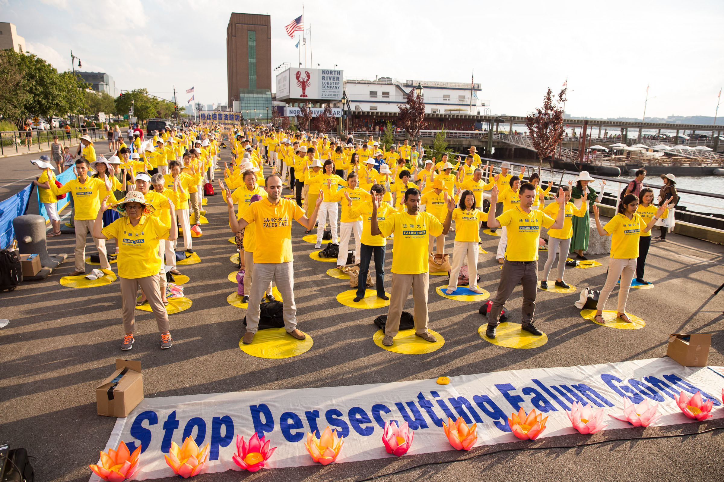 当天傍晚,法轮功学员纽约中领馆对面打出“停止迫害法轮功”、“全球起诉江泽民”、“法轮大法好”的横幅。数百名法轮功学员沿着河岸排列整齐,延绵上百米。他们先是演示法轮功的功法;随后在夜幕低垂时,学员们燃起点点烛光,默默悼念数百万在中共残酷的迫害中被夺去生命的同修。在学员静坐的最前面,一副写着:“停止迫害法轮功”的英文横幅,上面围绕了一圈、盛着点点烛光、象征法轮功学员圣洁、坚韧之精神的橘红色莲花座,场面肃穆而慈悲感人。
