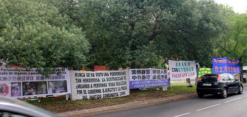 17日上午,西班牙法轮功学员在中领馆前举行集会活动,在中领馆对面的大街上建立起一道“真相长城”。身着“法轮大法好”黄色T恤衫的法轮功学员,随着悠扬美妙的炼功音乐演示法轮功五套功法,往来行人无不驻足观看,拍照留念;行驶车辆也都减缓速度,在红灯亮起车辆停止行驶的片刻,车主纷纷拉下车窗接过法轮功学员递上的真相传单,有的挥手或握拳表示支持。