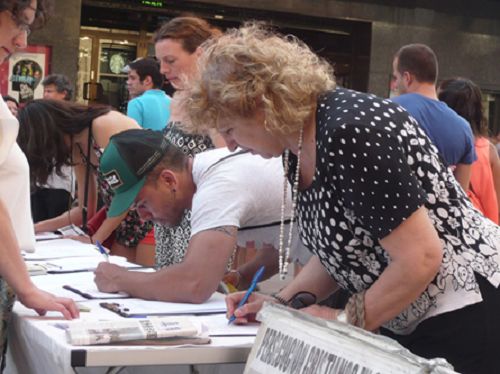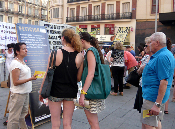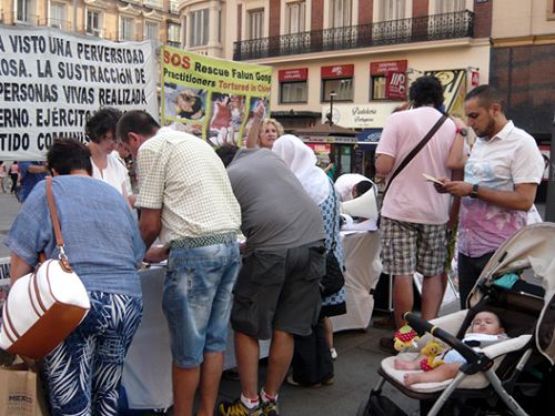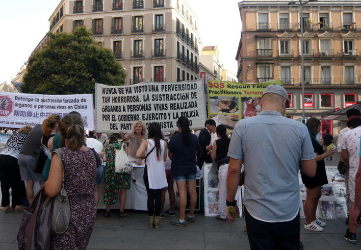 当日下午,法轮功学员在马德里市中心最繁华路段的Callao广场举办征签活动。Callao广场人潮涌动,其中不乏大陆游客。西班牙人热情奔放,听到中共“活体摘取器官”这一罪行后,纷纷表示难以接受,正经历“大选”的西班牙人对于中共的独裁更是深恶痛绝,这对正常的国际社会的人来说,简直不可理喻。他们不论男女老少,纷纷踊跃签名,谴责“活摘”罪行。