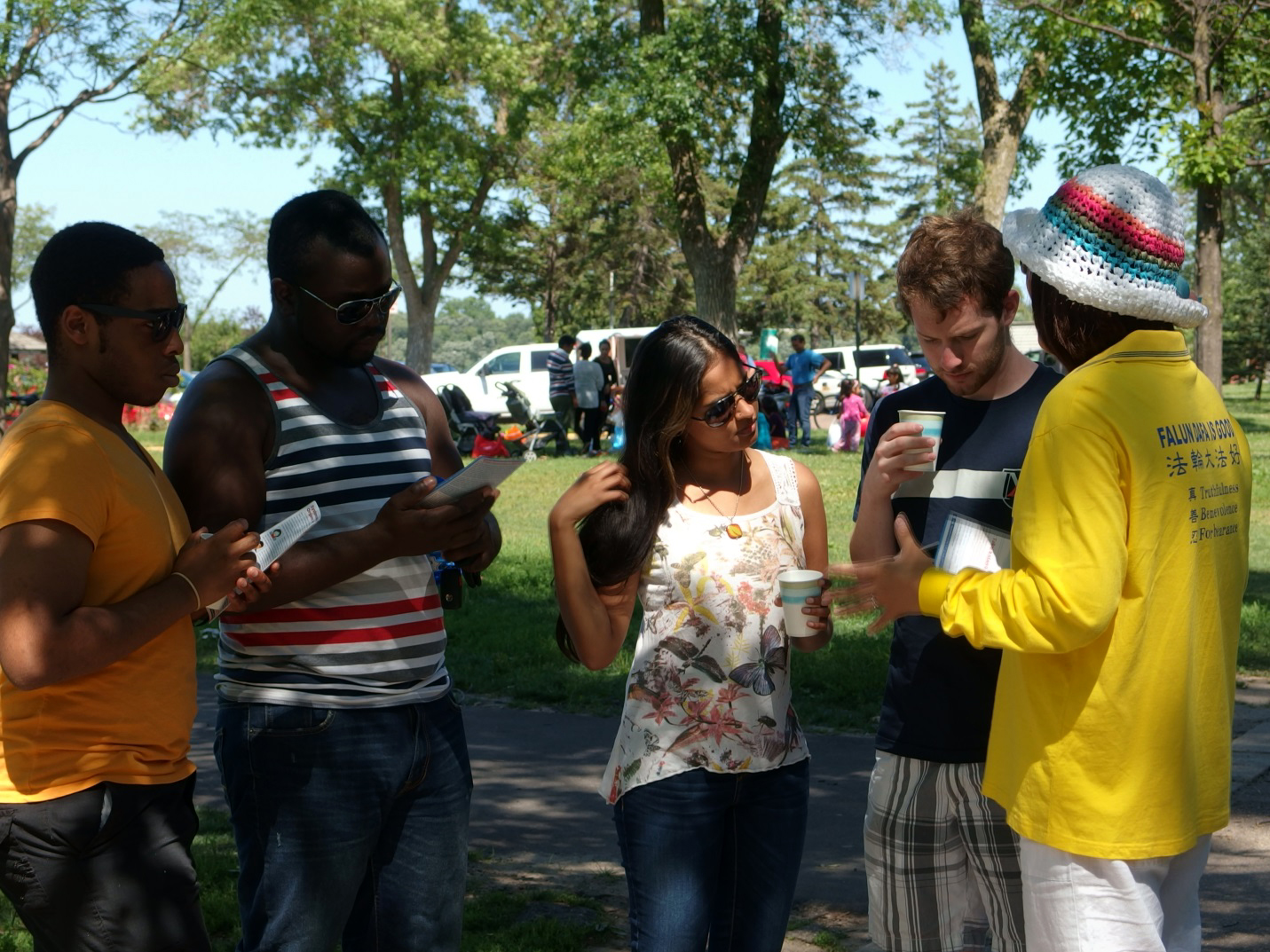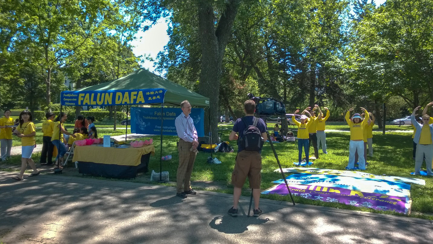 这一天阳光明媚,温度宜人,周末的公园里人来人往。很多人被法轮功学员祥和的打坐场面吸引,好奇地走近看个究竟。学员告诉他们:我们今天来这里,是为了制止十六年前开始的对法轮功的残酷迫害。在中国大陆,这样炼功打坐,按照“真、善、忍”做人的人,成为了中共镇压的目标。数以百万计的法轮功学员被投入监狱、劳教所、洗脑班,受到酷刑折磨,甚至成为器官移植的活供体。然而,当前令人振奋的是,诉江大潮已经兴起,已有至少八万多法轮功学员及世人已经以大无畏的勇气起诉迫害元凶江泽民,正义定将战胜邪恶。在这当中,我们每一个人如何看待这一历史事件,选择站在历史正义的一方,这是至关重要的。