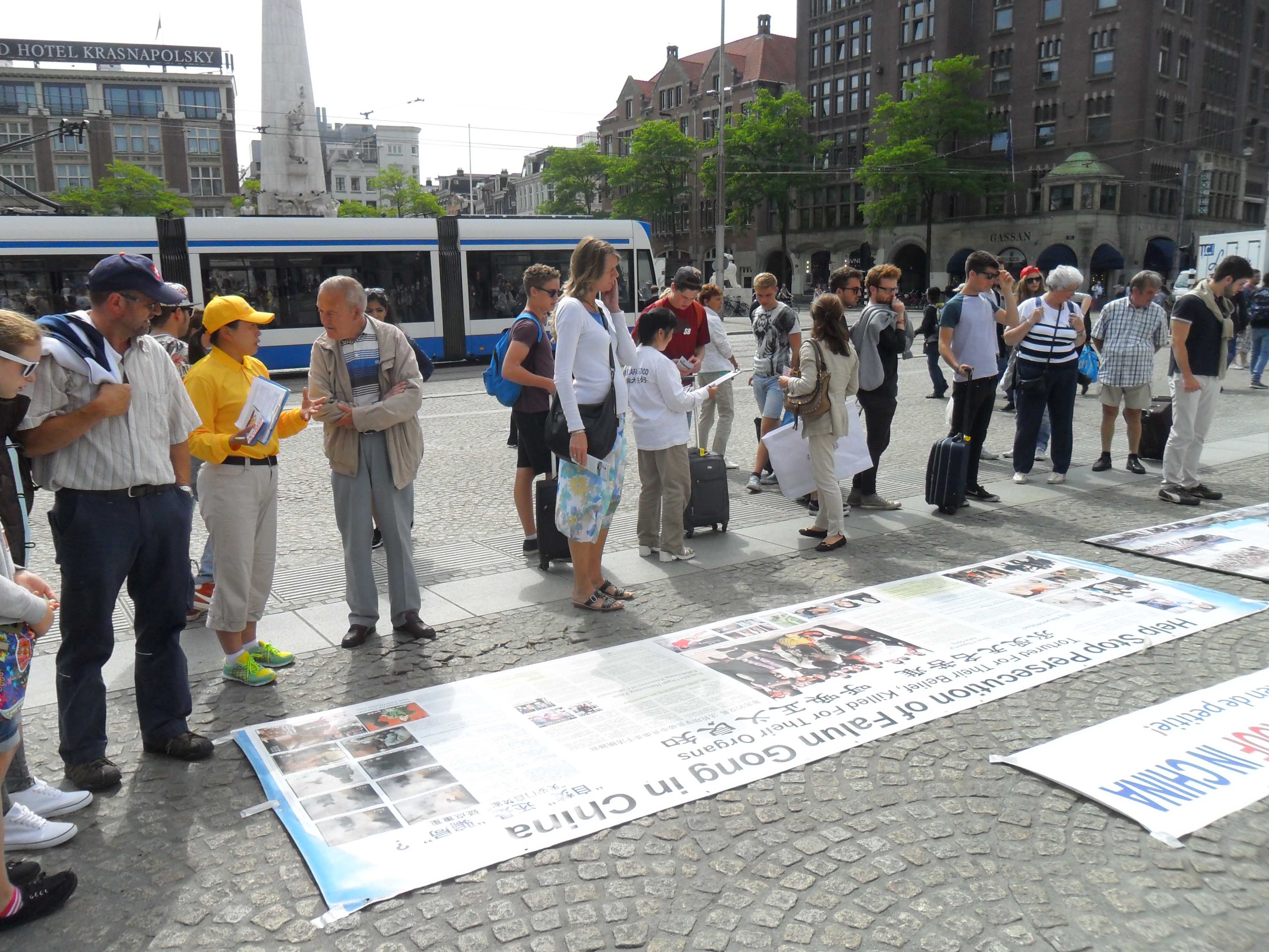 达姆广场是当地著名旅游点,每天都有大批各国游客前来游玩。许多游客认真阅读揭露中共酷刑迫害法轮功学员的真相展板。学员告诉他们,在迫害元凶前党魁江泽民的指挥下,中共如何残酷迫害法轮功学员的真相后,人们纷纷签名支持起诉江泽民。