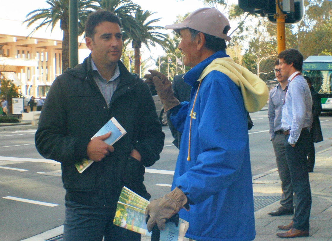 ![]() 图1:西澳法轮功学员在市中心的签证办公室楼外,向民众传播法轮功的真相。 |