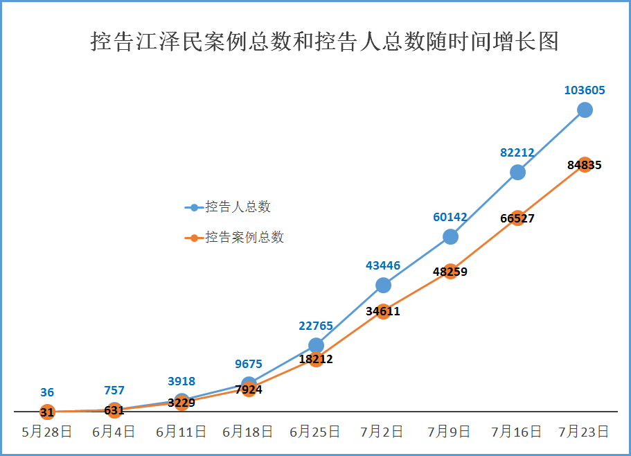 从五月底到七月二十三日,明慧网已收到总数103605名(84835案例)法轮功学员及家属递交给中国最高检察院、法院、公安部等相关部门的诉讼状副本。其中七月十七日至二十三日的一周之内,至少21389人(18306案例)递交诉状控告江泽民。由于网络封锁和信息传输的不便,实际数字不止于此。