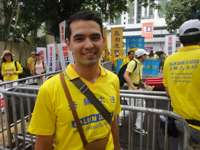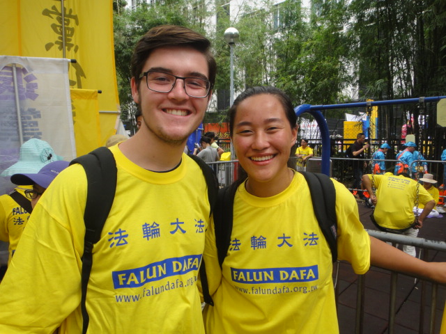 Philip Evich是马里兰大学(The University of Maryland)的学生,他和廖雨音(从小跟着父母亲一起修炼的华裔法轮功学员),从小一起在美国的小镇长大。他们是第一次参加香港的法轮功集会游行活动。