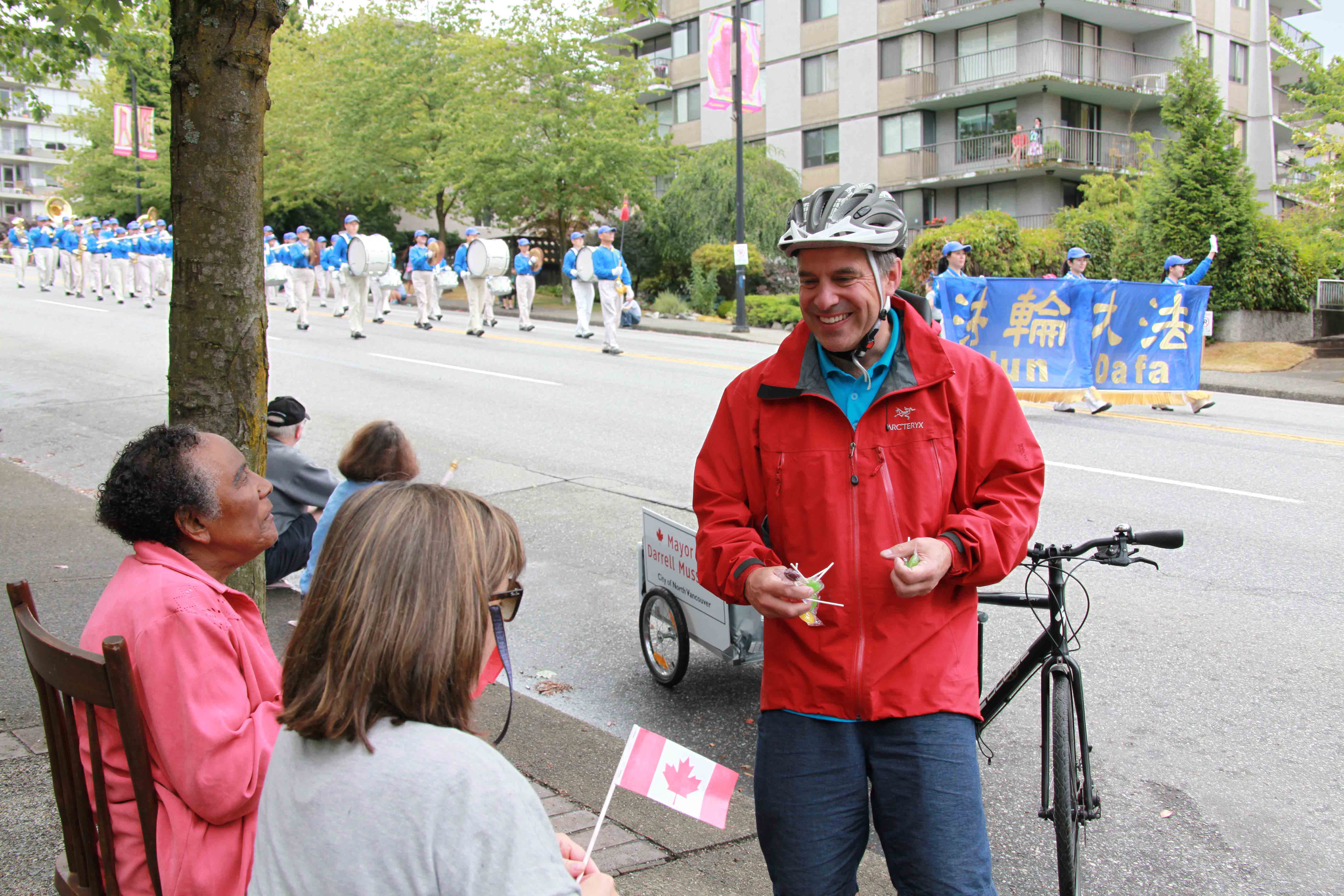 刘先生在中国大陆一所大学里教书,来温哥华探亲,他和太太,女儿,外孙女等全家人一起来看游行。他拿了法轮大法的真相资料,在路边专门用摄像机拍摄法轮大法学员的游行队伍。他表示,他在观看法轮大法学员的游行队伍,挺祥和的。国内国外不一样,在加拿大人们都很放松,他很喜欢当天的游行,也很喜欢加拿大,以后会经常来。