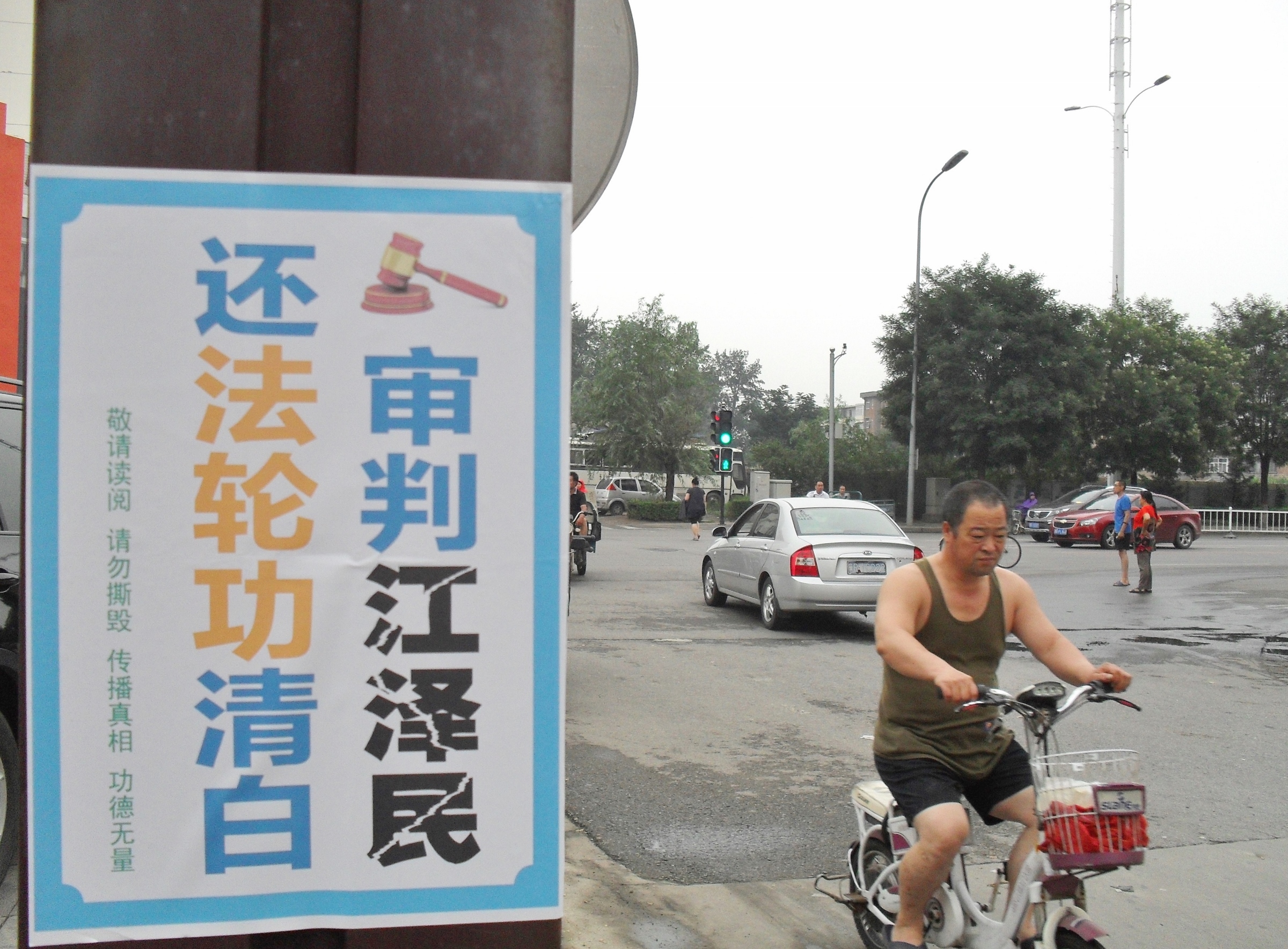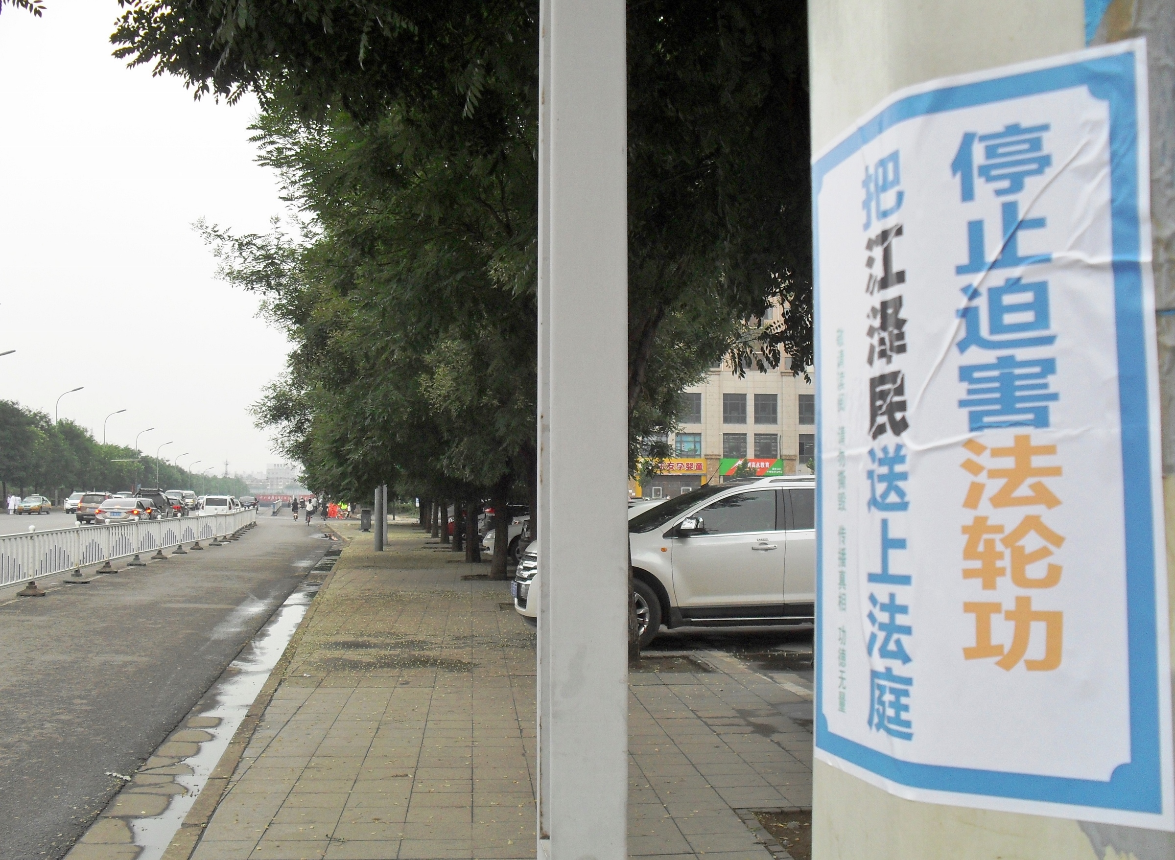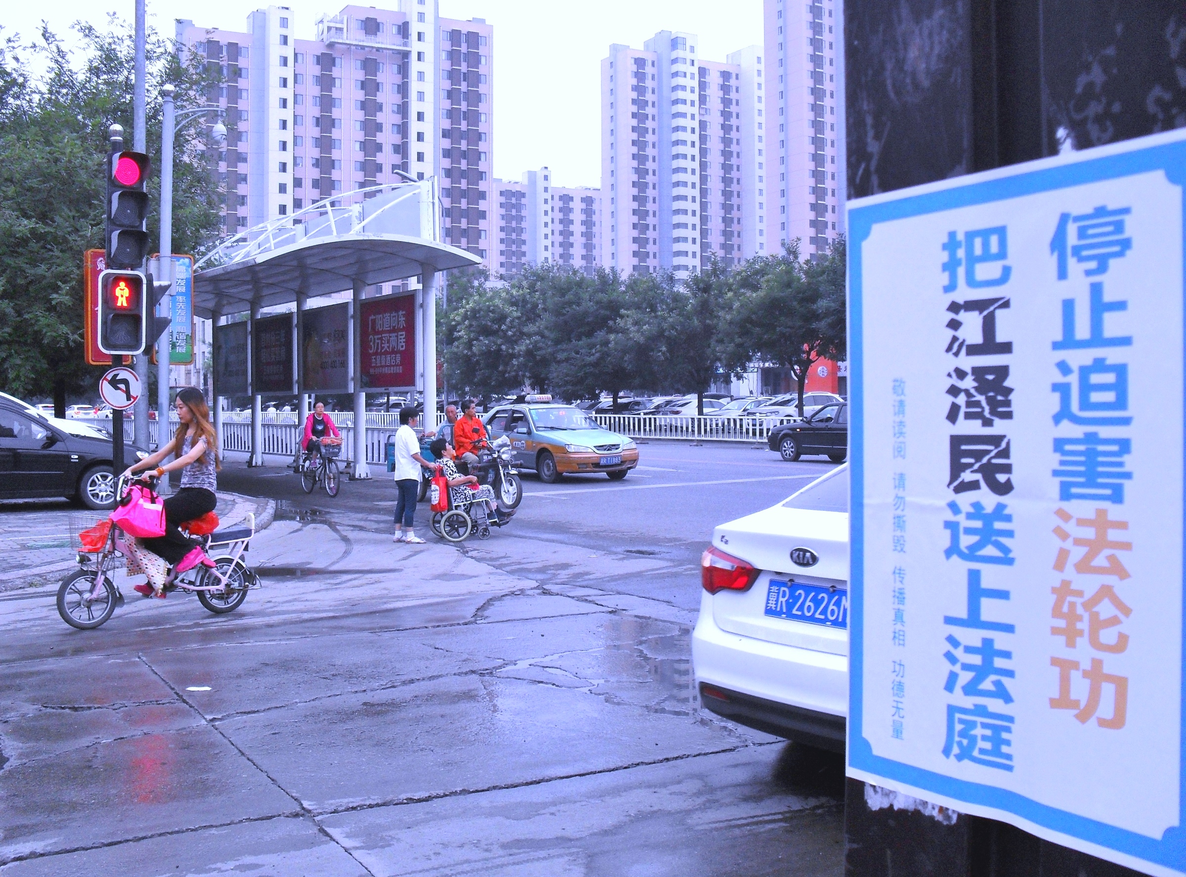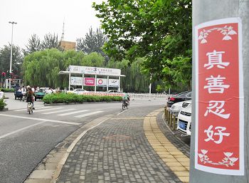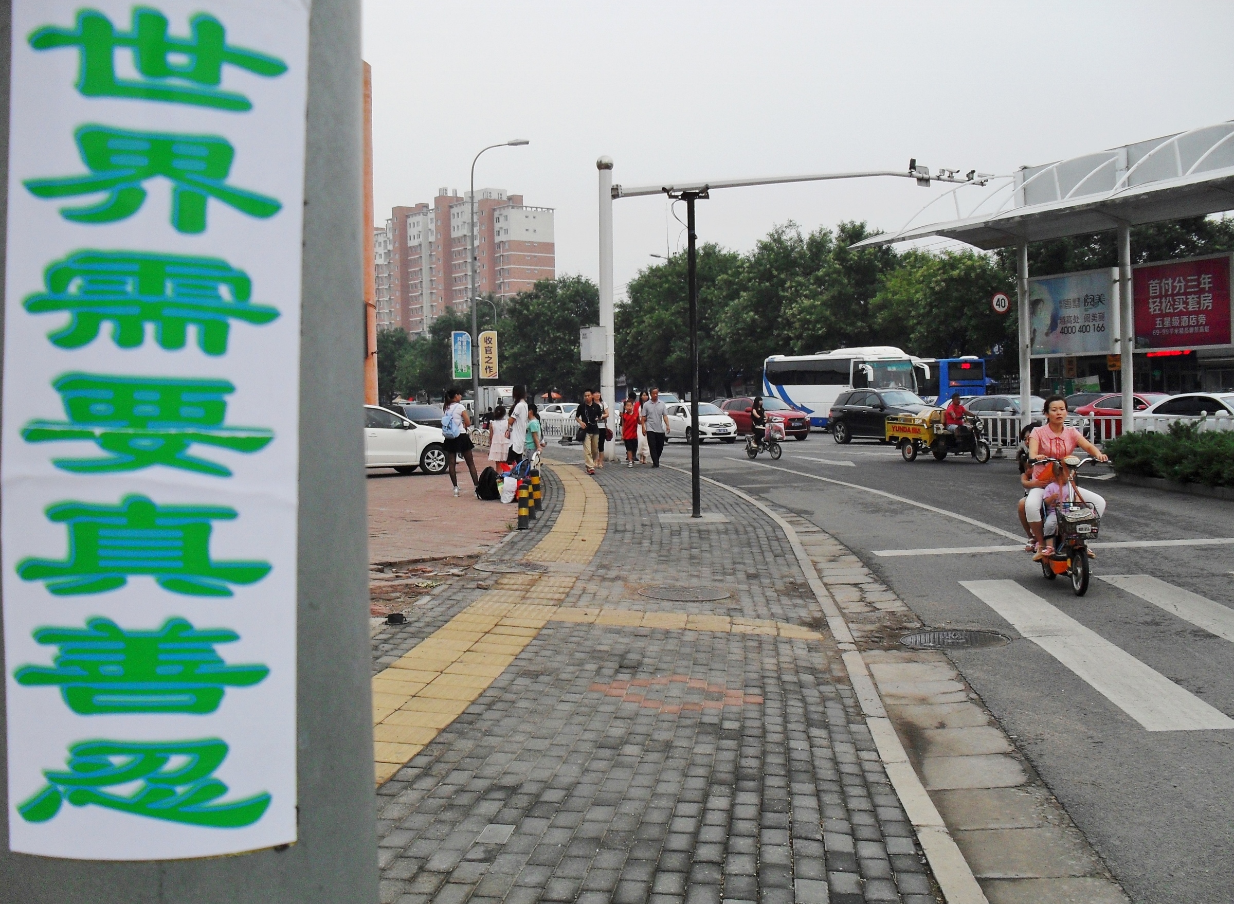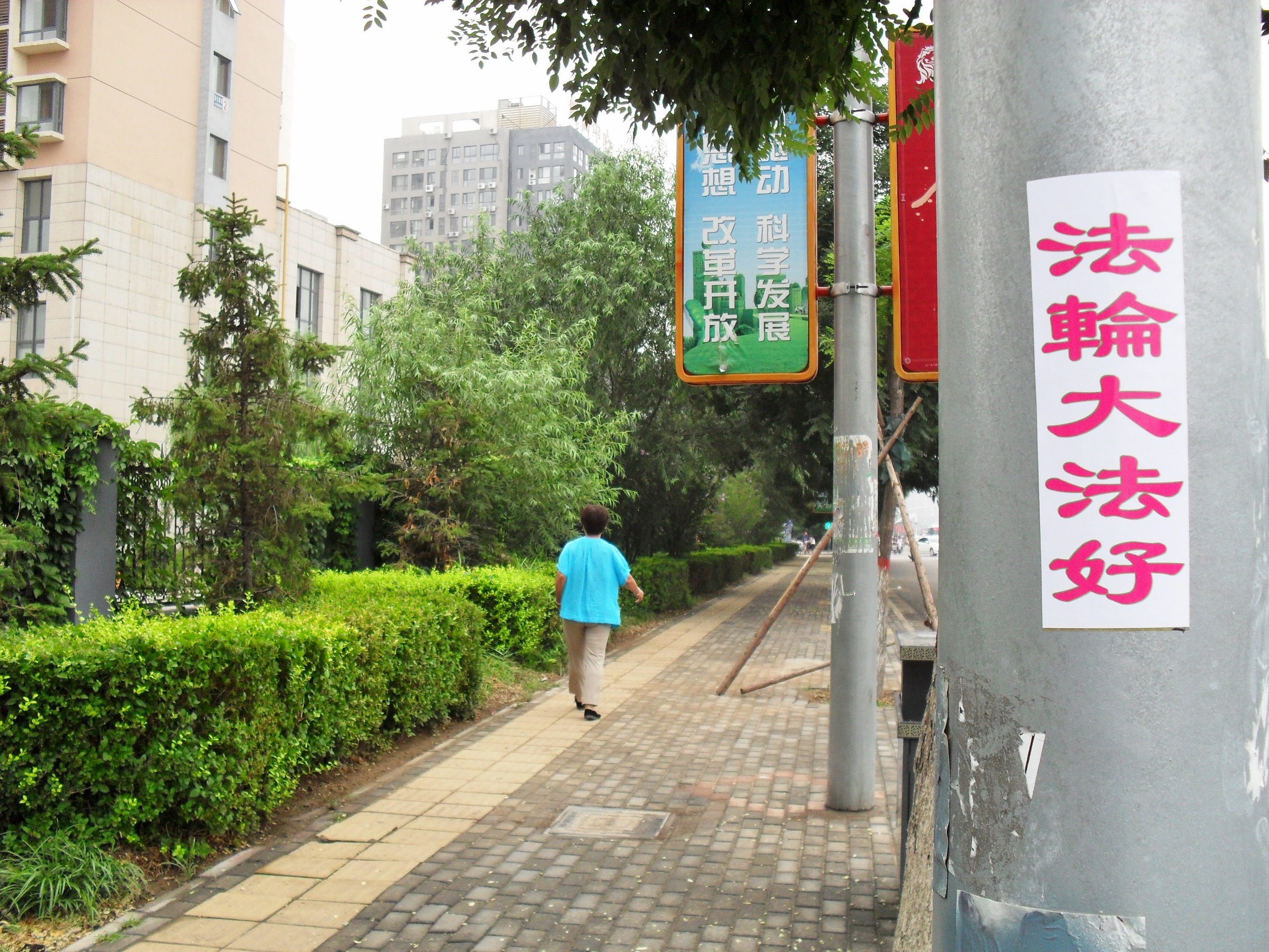 【明慧网二零一五年七月二十七日】二零一五年七月二十日,在河北省廊坊市的主要街道、十字路口、车站、停车场、公园、幼儿园、公路两旁等处,人们可以见到“全民起诉江泽民,停止迫害法轮功”、“起诉江泽民,还人间正道”、“停止迫害法轮功,把江泽民送上法庭”、“审判江泽民,还法轮功清白”、“道义法庭、人心法庭、人间法庭”、“起诉江泽民,上顺天意下应民意”、“起诉江泽民,结束迫害”、“江泽民在30多国被起诉”、“历史的审判已开始”、“民意汹涌声援公审江泽民”、“海内外纷纷控告江泽民掀起诉江潮”“法轮大法好”、“真善忍好”、“世界需要真善忍”、“天灭中共退