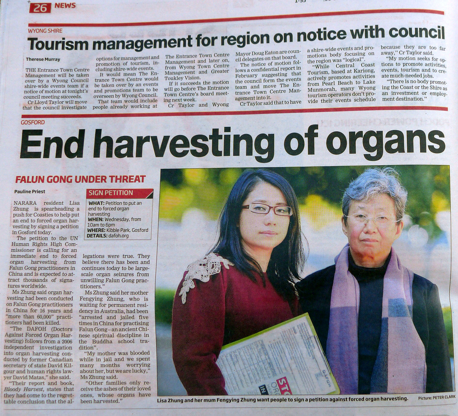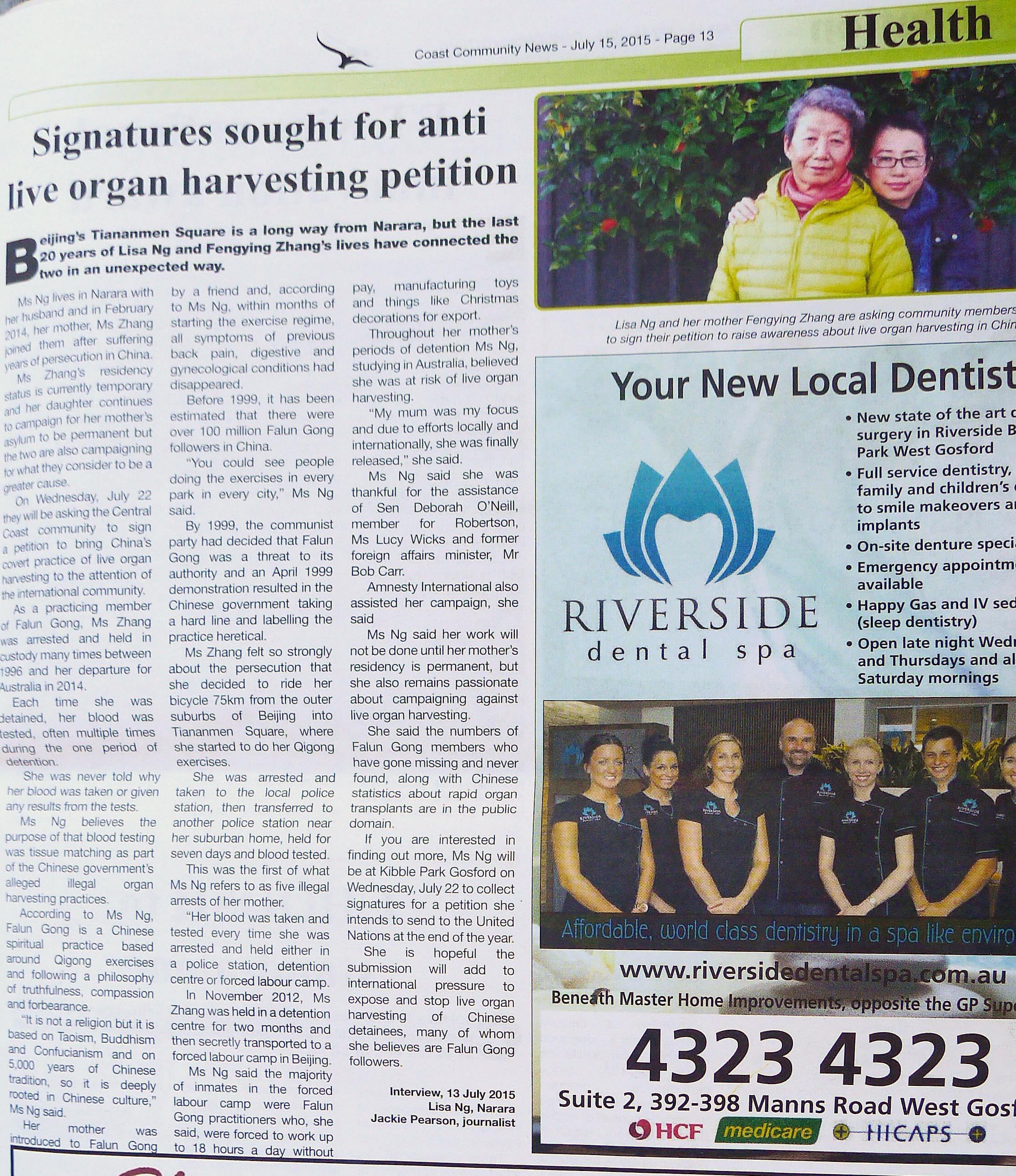 另一家报纸——中央海岸快导报(Central coast express advocate),在七月二十二日,刊登了以“停止活摘器官”为题的报道。在报道中写到:“为帮助制止强行‘活摘’器官,纳拉腊居民张丽莎今天(七月二十二日)正敦促戈斯福德居民签署一份请愿书,该请愿书将呼吁联合国人权事务高级专员采取行动,立即制止在中国(发生的)强行摘取法轮功学员器官。此项请愿书预计将有成千上万世界各地的民众签名。”