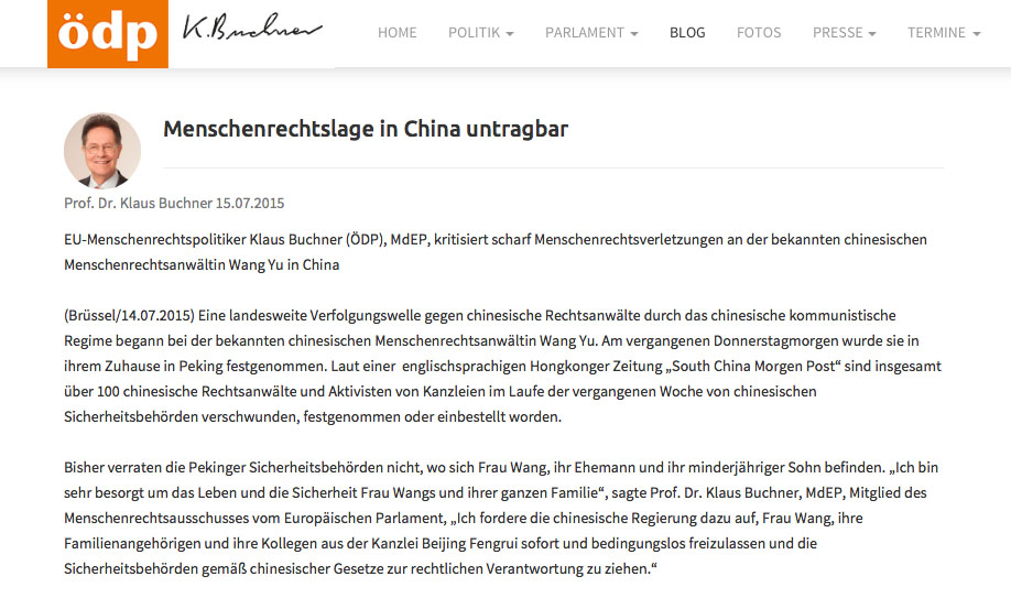 布赫纳议员非常关注遭受迫害的大陆知名维权律师王宇女士。“到现在为止,北京的警察都没有透漏王女士,她的丈夫和她未成年的儿子被关押在哪里。我非常担心王女士与她全家人的生命安危,”他说,“我敦促中国政府立即无条件释放王女士,她的家人和她的北京锋锐律师事务所的同事们,并按照中国的法律规定追究公安部门的法律责任。”