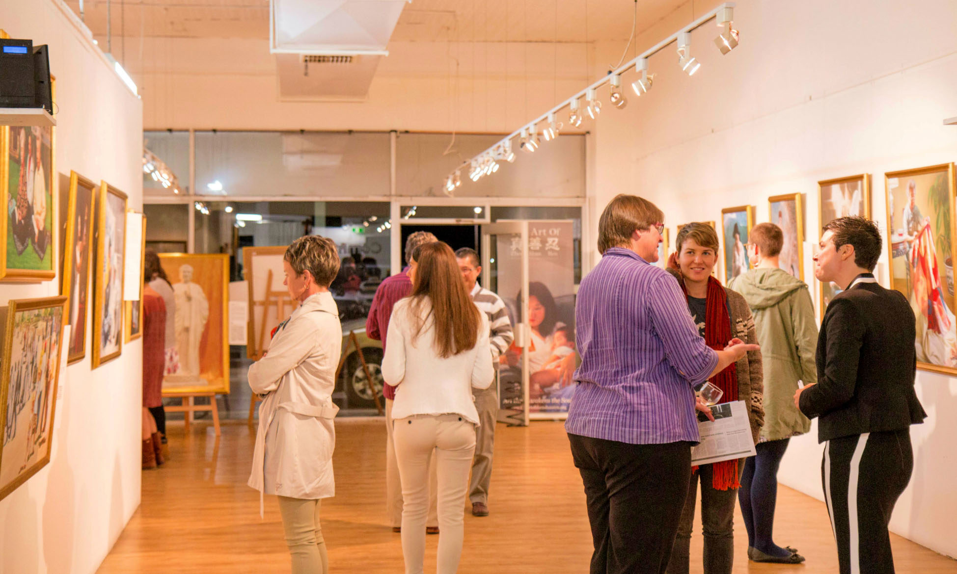 画展于周五七月十七日傍晚六点在ACDC社区画廊(ACDC Community Gallery)举行开幕仪式,有不少艺术界人士与当地主流民众前来参观,并与法轮功学员们交谈和提出问题。