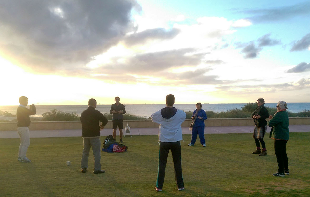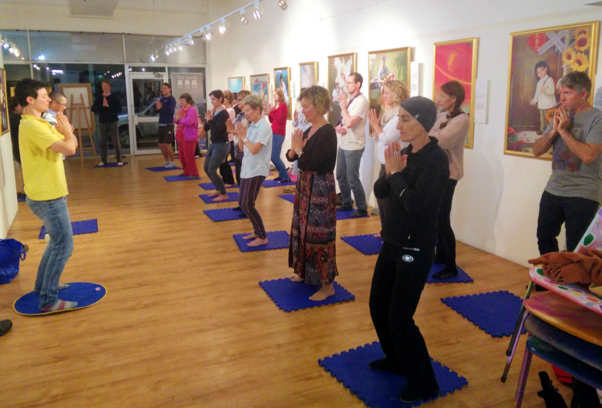 画展的最后一天傍晚,法轮功学员们在海滨步道炼功,有些民众获知消息后赶来参加集体炼功,美好祥和的炼功氛围为这次杰拉尔顿市的真善忍国际美展和弘法教功活动划下了完满的句点。