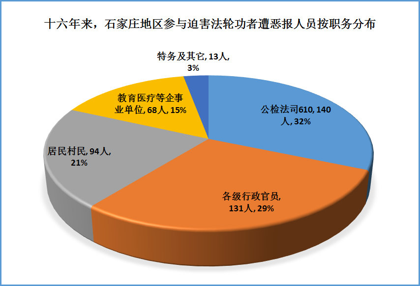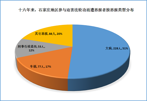 自一九九九年“七二零”至今,据明慧网不完全统计,石家庄地区因迫害法轮功而遭恶报的人数已有至少446人。其中当事人遭恶报的有346人,牵连到家属遭恶报的有100人。具体恶报涉及到石家庄地区十八个县市的公检法司部门、各级政府官员、企事业单位及个人。