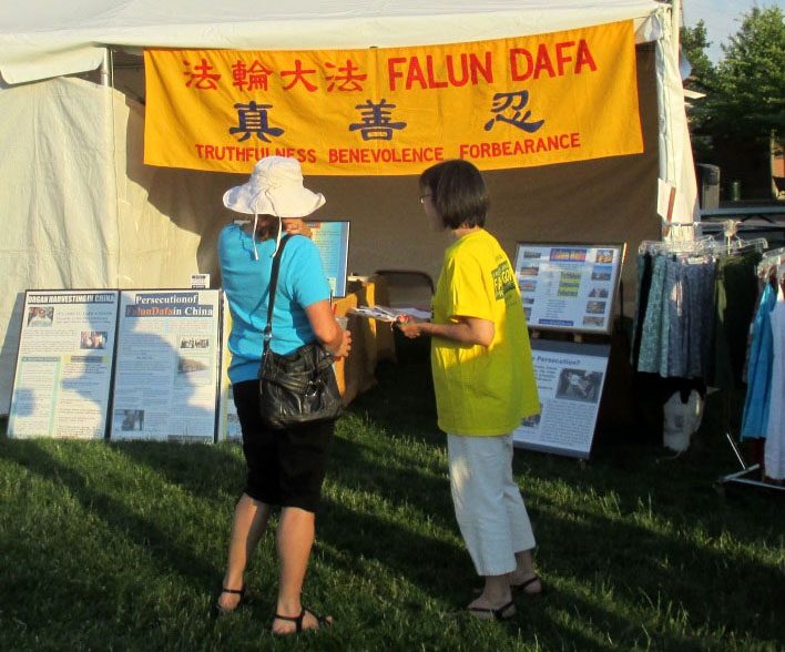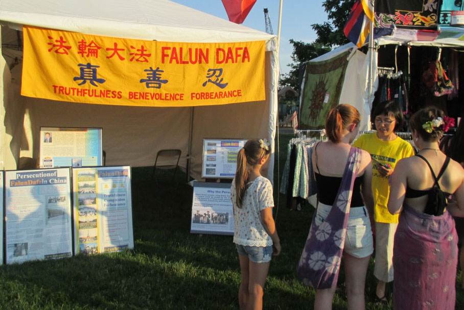 该活动在风景优美的河边公园举行,在这拥有五个世界村、九个表演区以及一百多个摊位及其它竞技节目的文化节上,法轮大法的展位与众不同。法轮大法的“真、善、忍”理念、优美平和的音乐与残酷至极的迫害甚至活摘器官形成鲜明的对比,震撼着每一位前来了解真相的游客。尽管天气炎热,很多人仍然站在烈日下仔细倾听学员跟他们介绍的大法的真相。