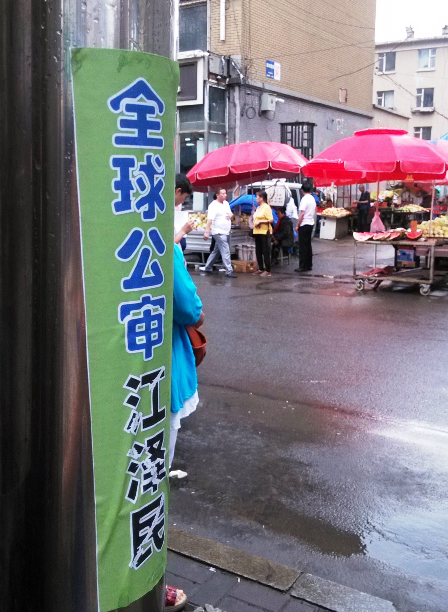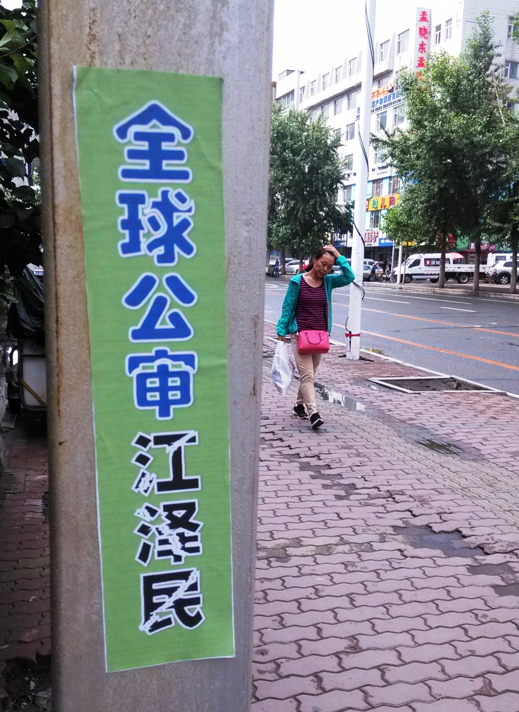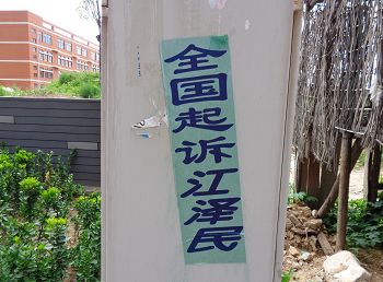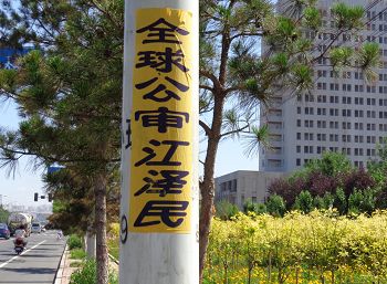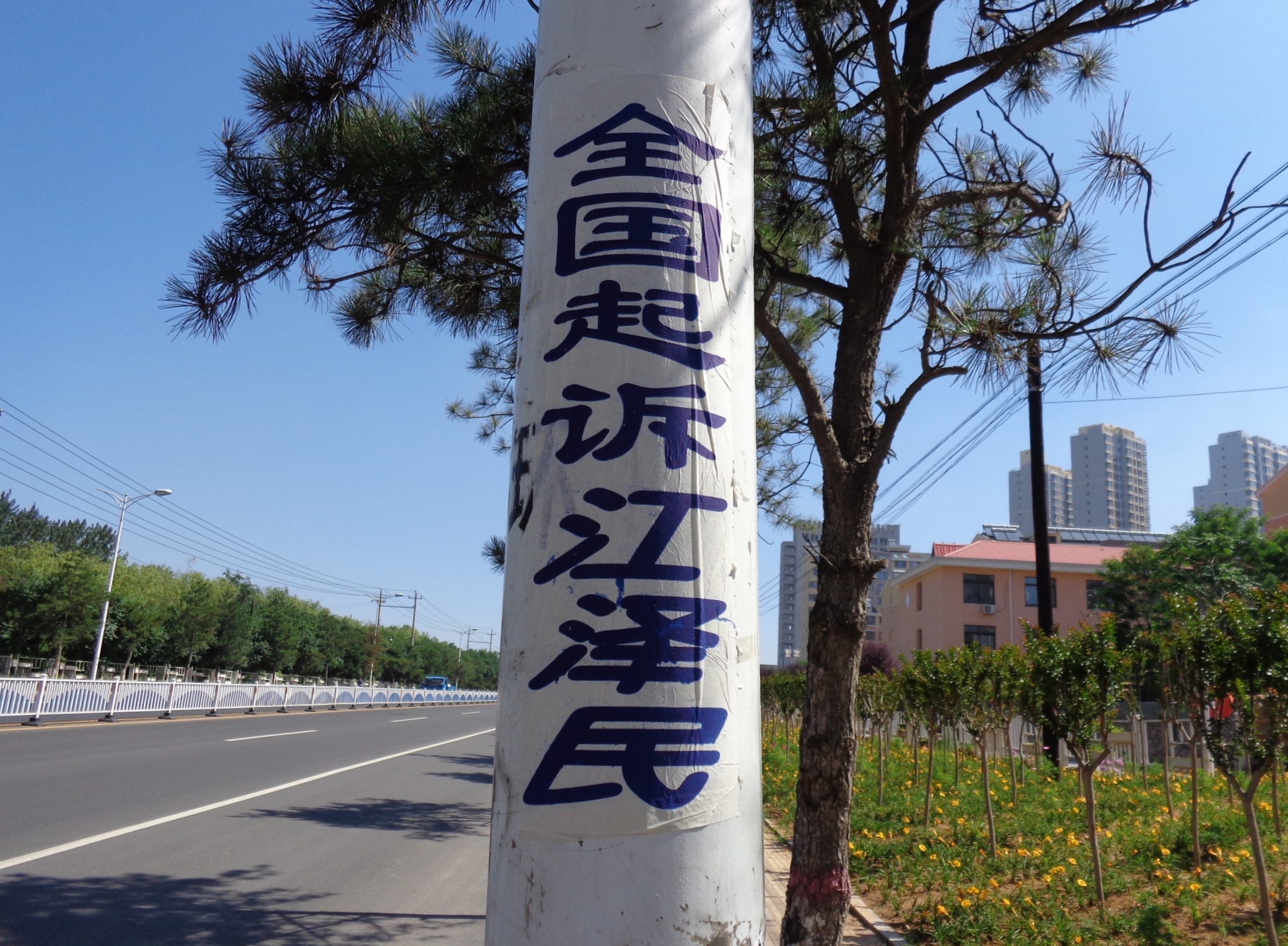 河北省秦皇岛地区在主要街道和住宅区出现“全国起诉江泽民”、“全球公审江泽民”的标语。