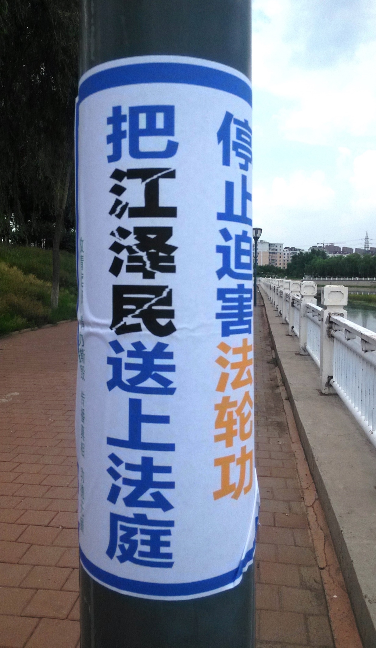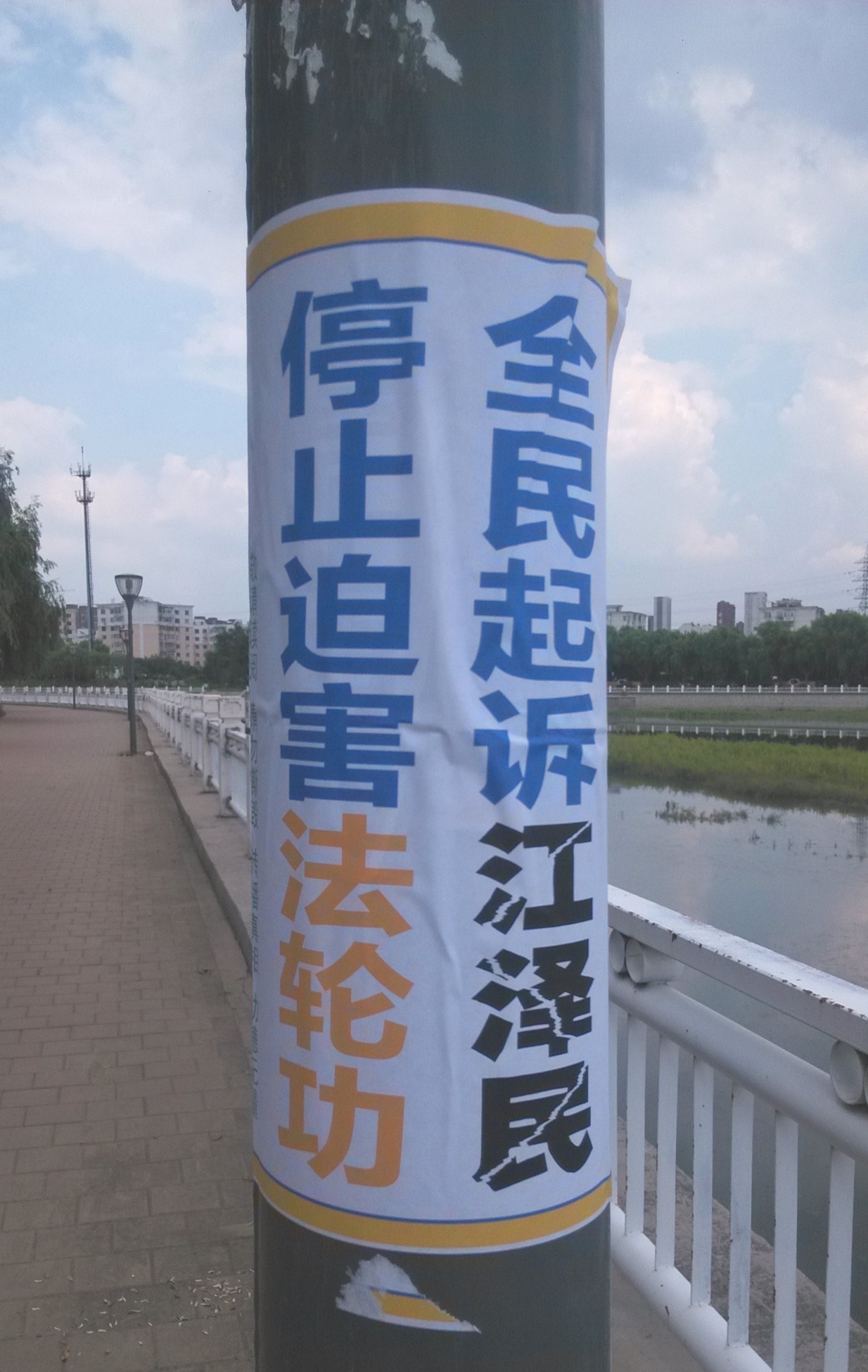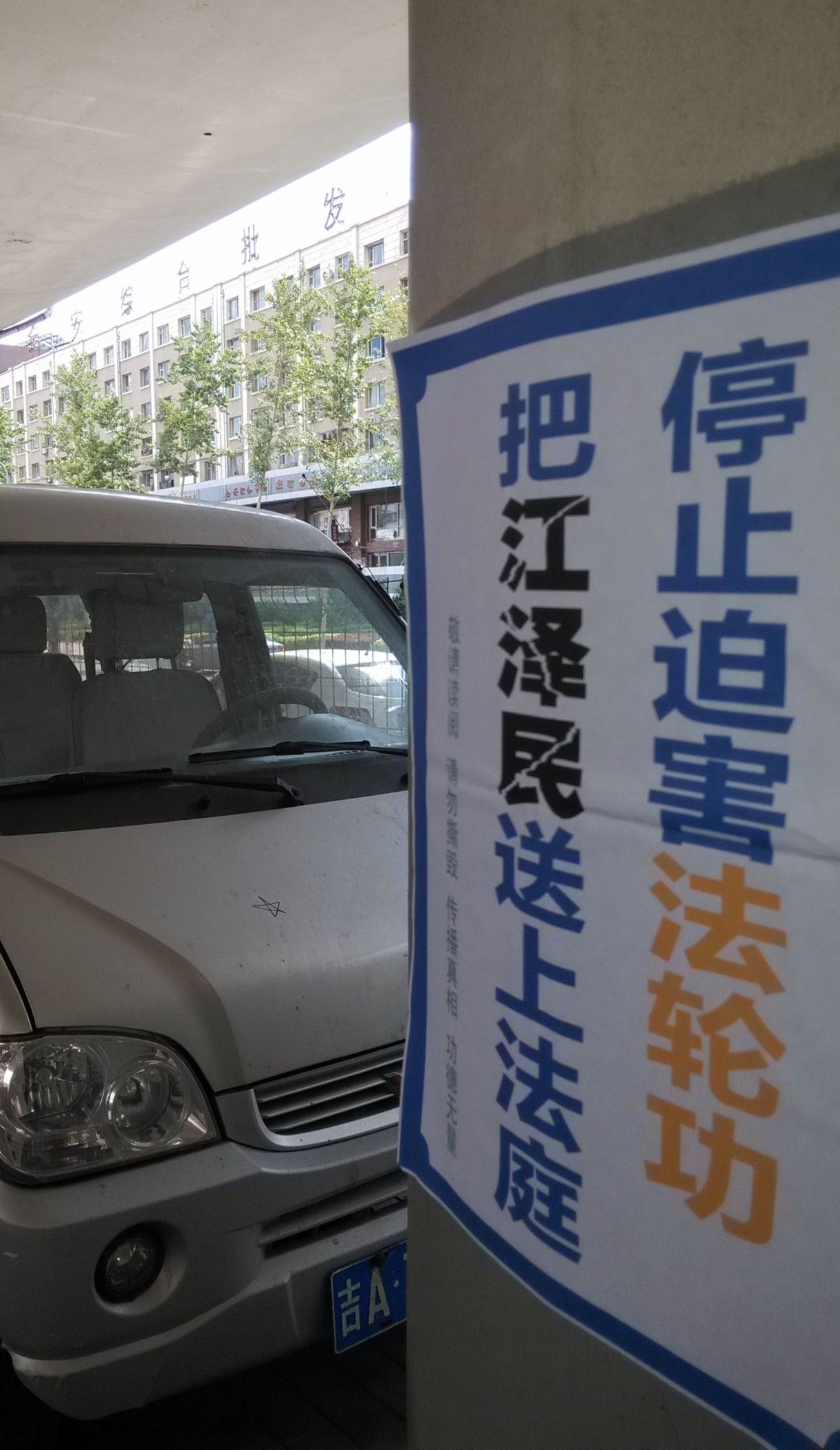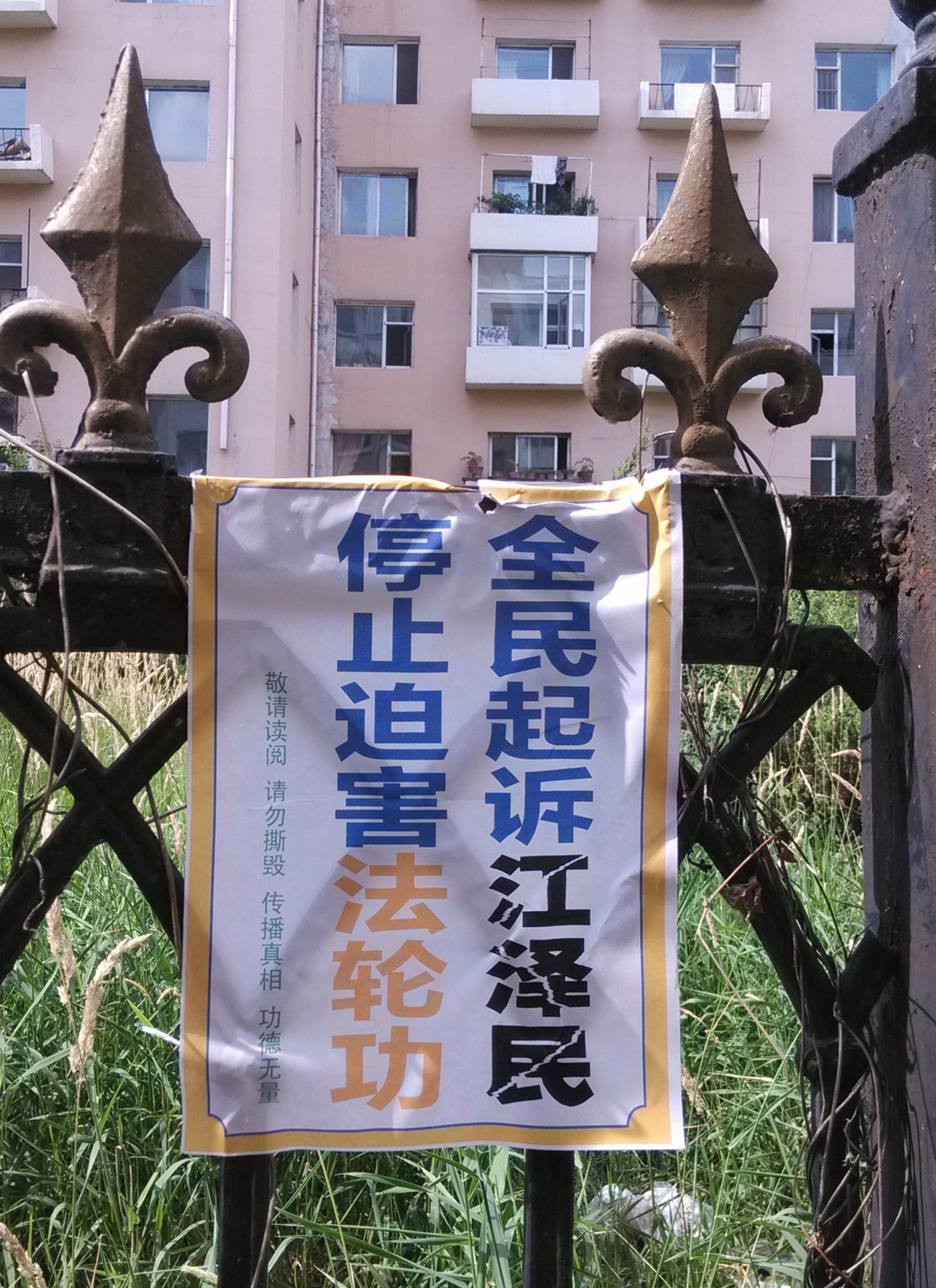 在长春早市、小区、公路、晨练区等处,人们可看到“起诉江泽民,还人间正道”、“还法轮功清白,公审江泽民”、“停止迫害法轮功,把江泽民送上法庭”、“全民起诉江泽民、停止迫害法轮功”等标语。