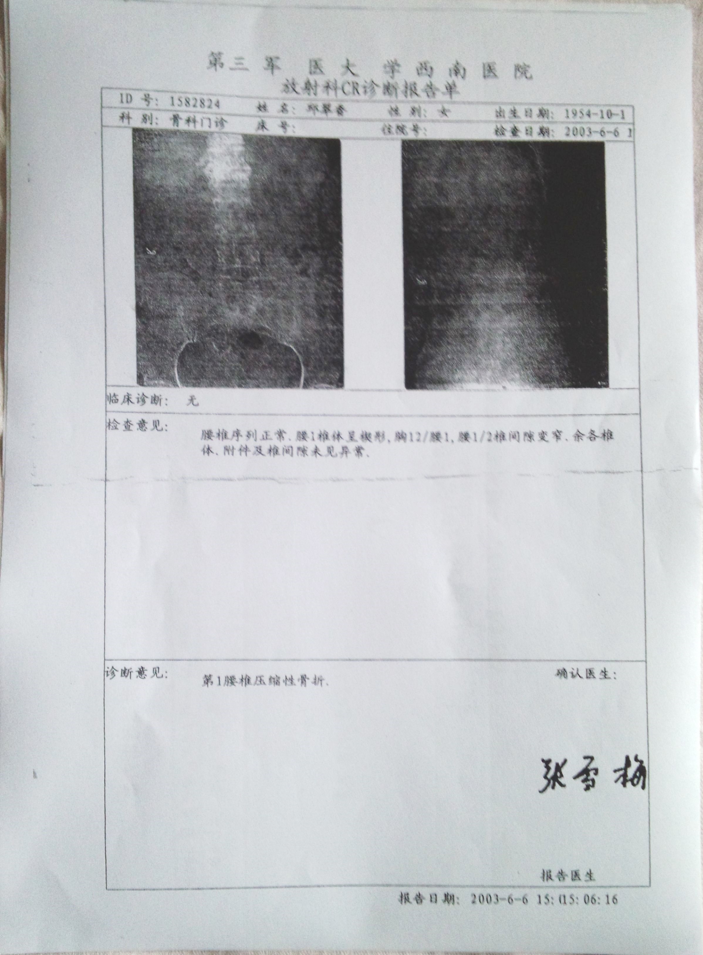 在非法关押期间二次延长劳教,我遭受了连续不让睡觉、灌食、被连续关小间三个月,随时被罚站军姿、熬夜、挨打、脱光衣物羞辱等各种酷刑。后来经医院检查,从病历显示,因迫害致使我第一腰椎压缩性骨折。
