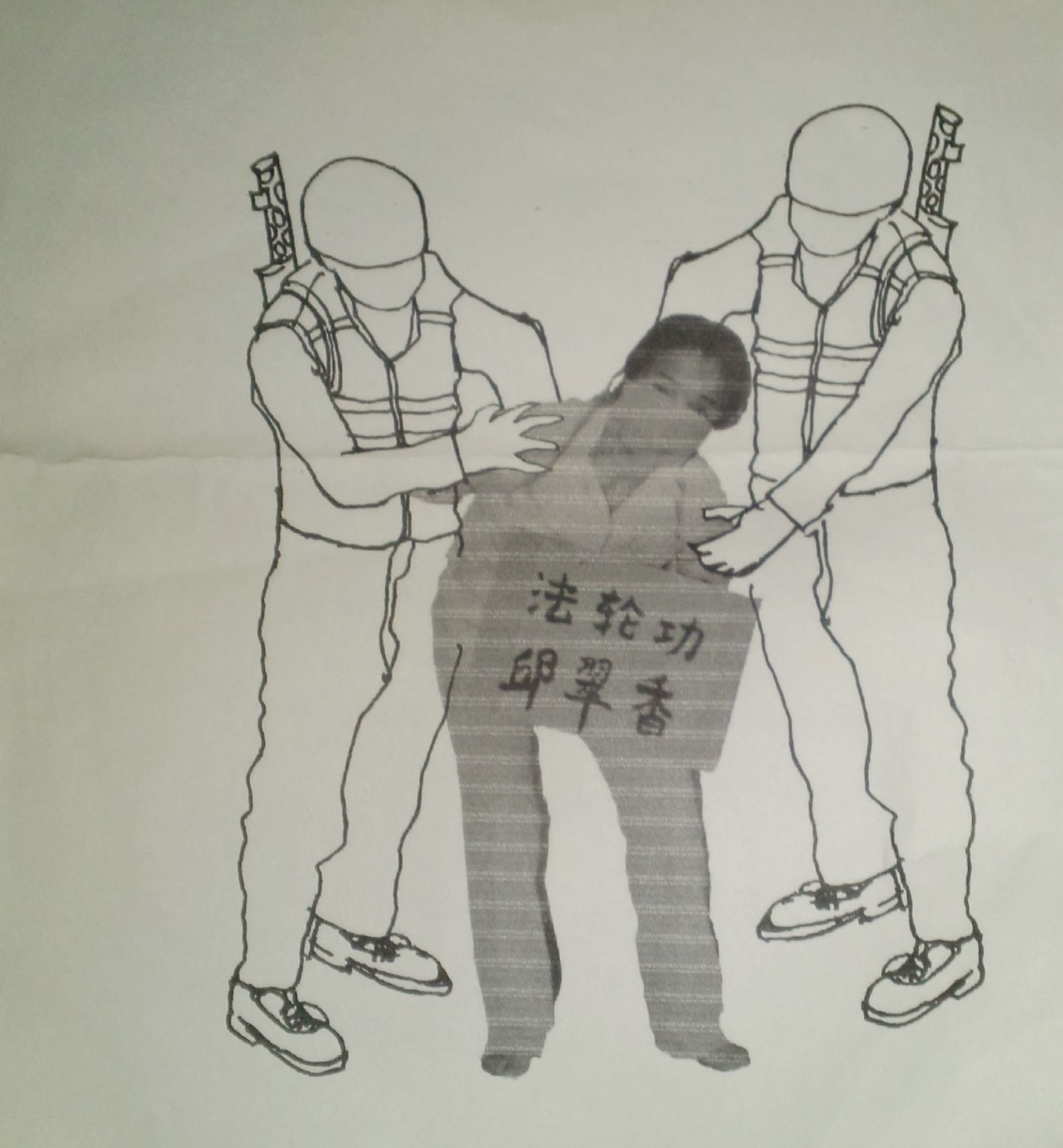 警察用黄胶封住我的嘴,不准我讲话,两个狱警双手压我肩使劲提绳子,把我五花大绑拖拉着在劳教所几个队示众。