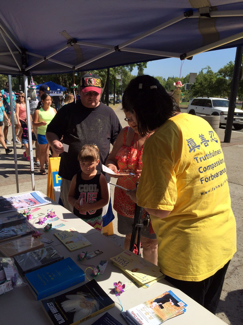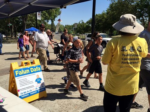 一位年轻华人推着婴儿车来到博览会正门,远远地看到法轮功展台,就快步走过来拿了资料道了谢离开。因为正值暑假期间,有好些从大陆或台湾来短期学习的中小学生,他们都表示有兴趣了解真相,拿了不少资料。一位戴眼镜的十一、二岁男孩,正要拿真相资料时,他的美国监护人立刻问他,是否确定要拿资料?是否知道他拿的是什么?男孩郑重地对大家说:“我知道法轮功,但不了解,我想要知道更多!”在拿了足够的真相中英文资料后,学员问他,你还想看《·九·评*共产党》吗?他又郑重地一点头:“是的”。最后,跟他一起的另外两个大陆男孩也都拿了真相资料后满意地离开。