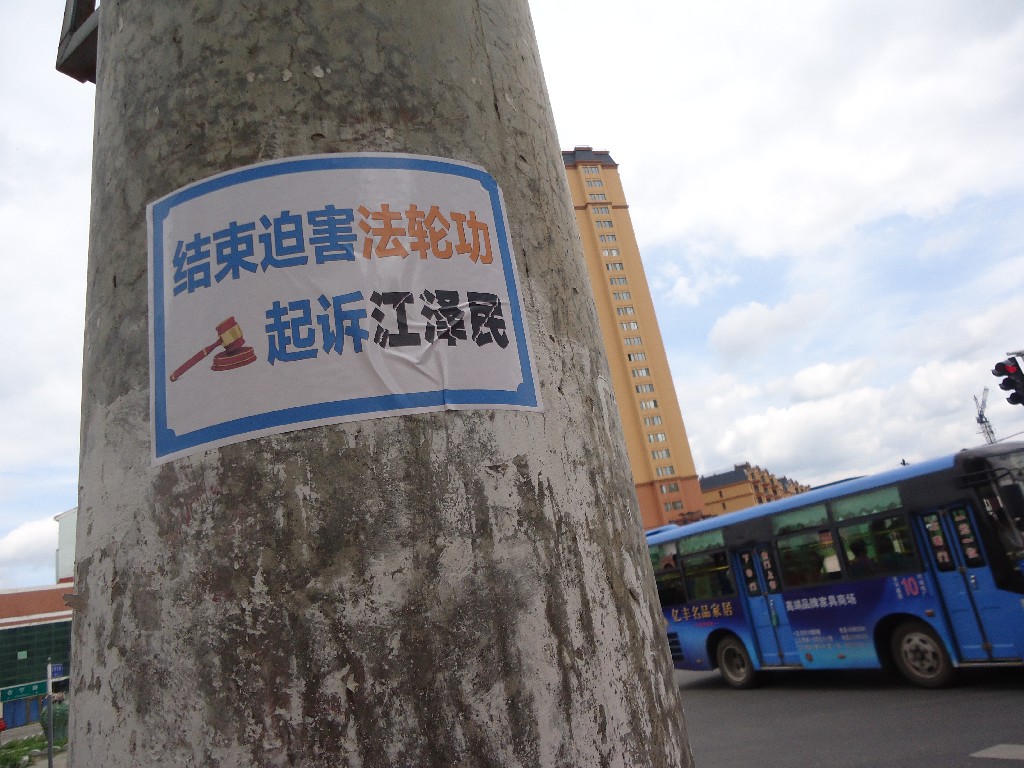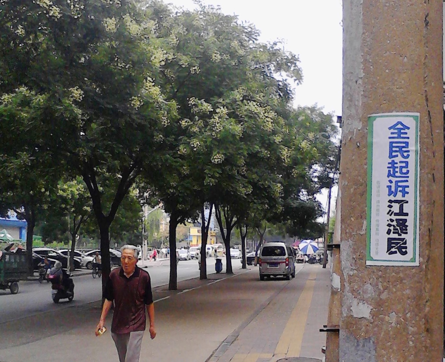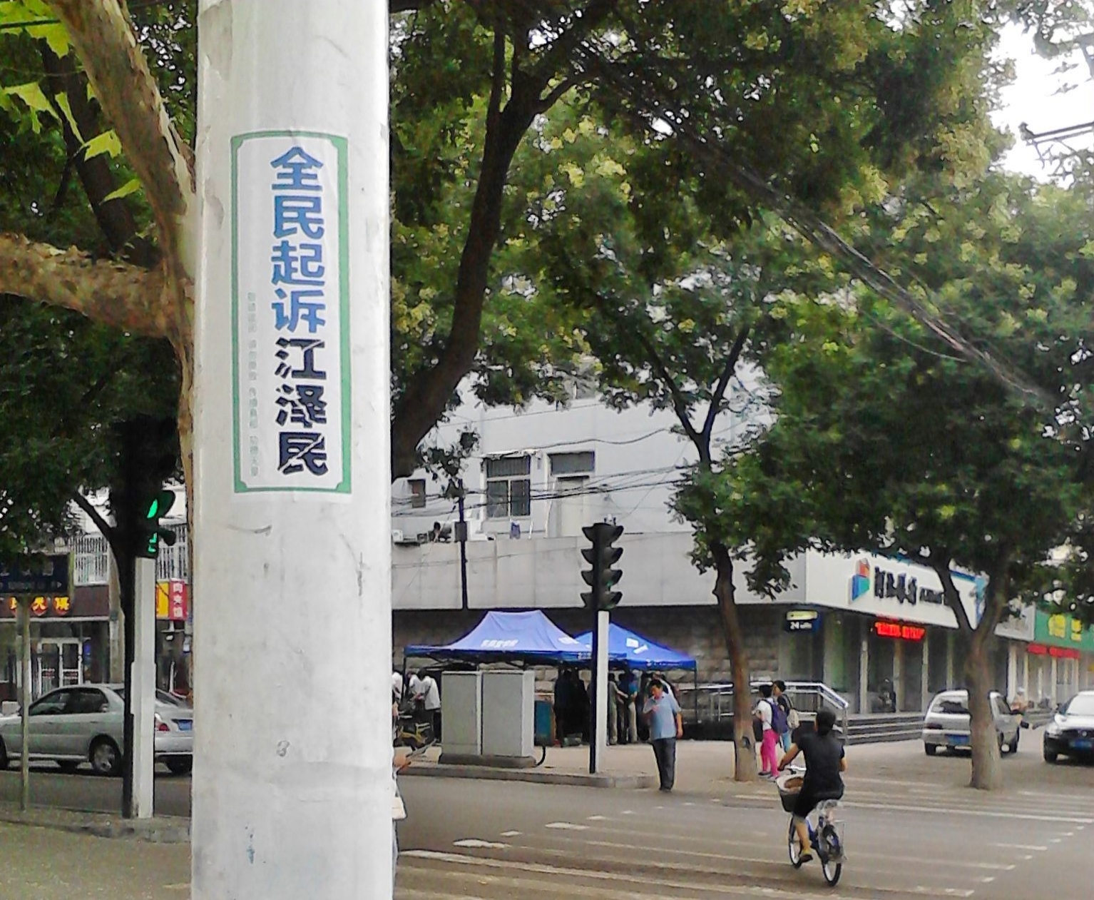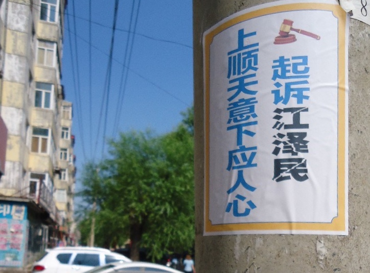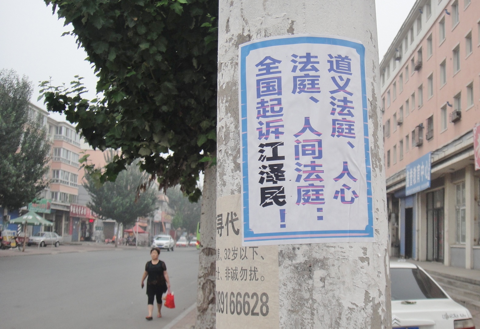东北、河北、山东、内蒙、江西、云南以及甘肃等地,人们在大街小巷、住宅区、公园、闹市区等处都能见到“起诉江泽民”的标语、不干胶,以及书写“法轮大法好”的标语等。