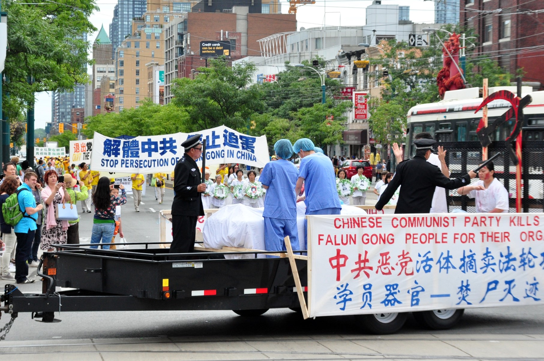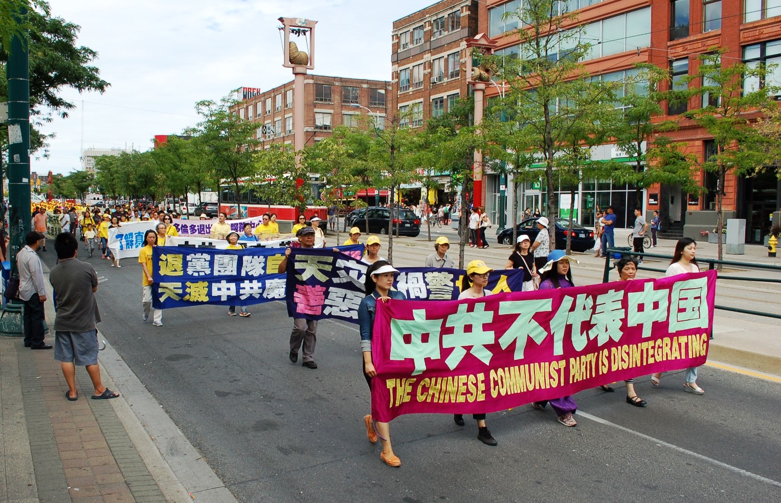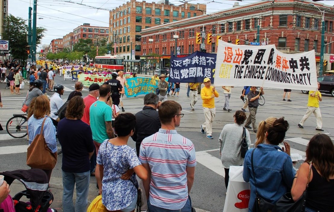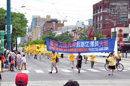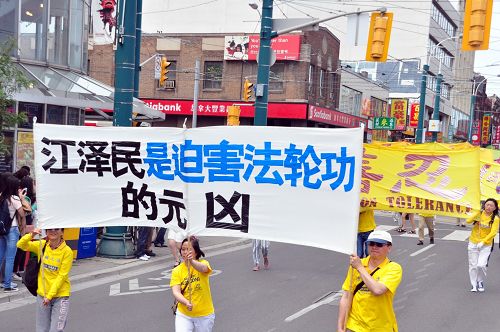 二零一五年八月八日,多伦多法轮功学员数百人在市中心举行声援全球诉江游行,队伍从市中心的克拉伦斯公园(Clarence Park)开始,到唐人街,然后向北到达大学街,再回转穿过唐人街,最后回到克拉伦斯公园。浩浩荡荡的队伍令到沿途中西方的观众纷纷拍照和了解真相,有华人观众表示:“是该把罪魁祸首送上审判台的时候了”;有西人观众表示“任何迫害人的刽子手都是要送上审判台的,越快越好”。