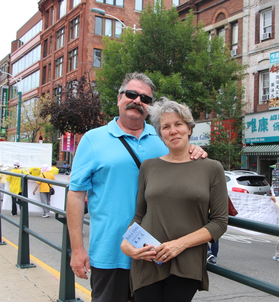 来自美国得克萨斯州的Wendy & Dr Paul Leung夫妻俩,他们看到游行队伍出发前的阵势非常惊讶,跟几位法轮功学员交谈后,她说:“我们之前就了解法轮功,也知道法轮功在中国的情况,我们是来多伦多参加一个国际交流会,经过这里时听到有中国的传统音乐就过来了,听了几位法轮功学员的介绍后,知道是支援‘全球起诉江泽民’的游行。这样的游行非常好,鼓励更多的人站出来控告江泽民,让全世界的人都知道他做了什么,一起来把他送上历史的审判台,任何迫害人的刽子手都是要送上审判台的。”