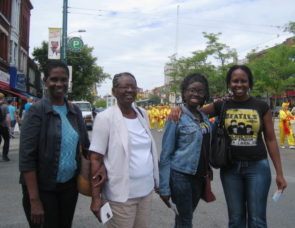Ruth Rodney女士是多伦多大学的博士,今天和家人一起在逛街。看到游行队伍经过时,Ruth Rodney女士非常高兴地和家人一块儿和游行队伍合影。