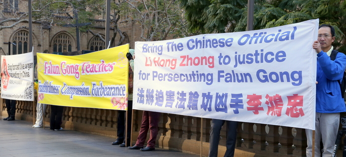 ![]() 法轮功学员上举“法办迫害法轮功凶手李鸿忠”等反迫害横幅抗议李鸿忠来访悉尼市政厅 |