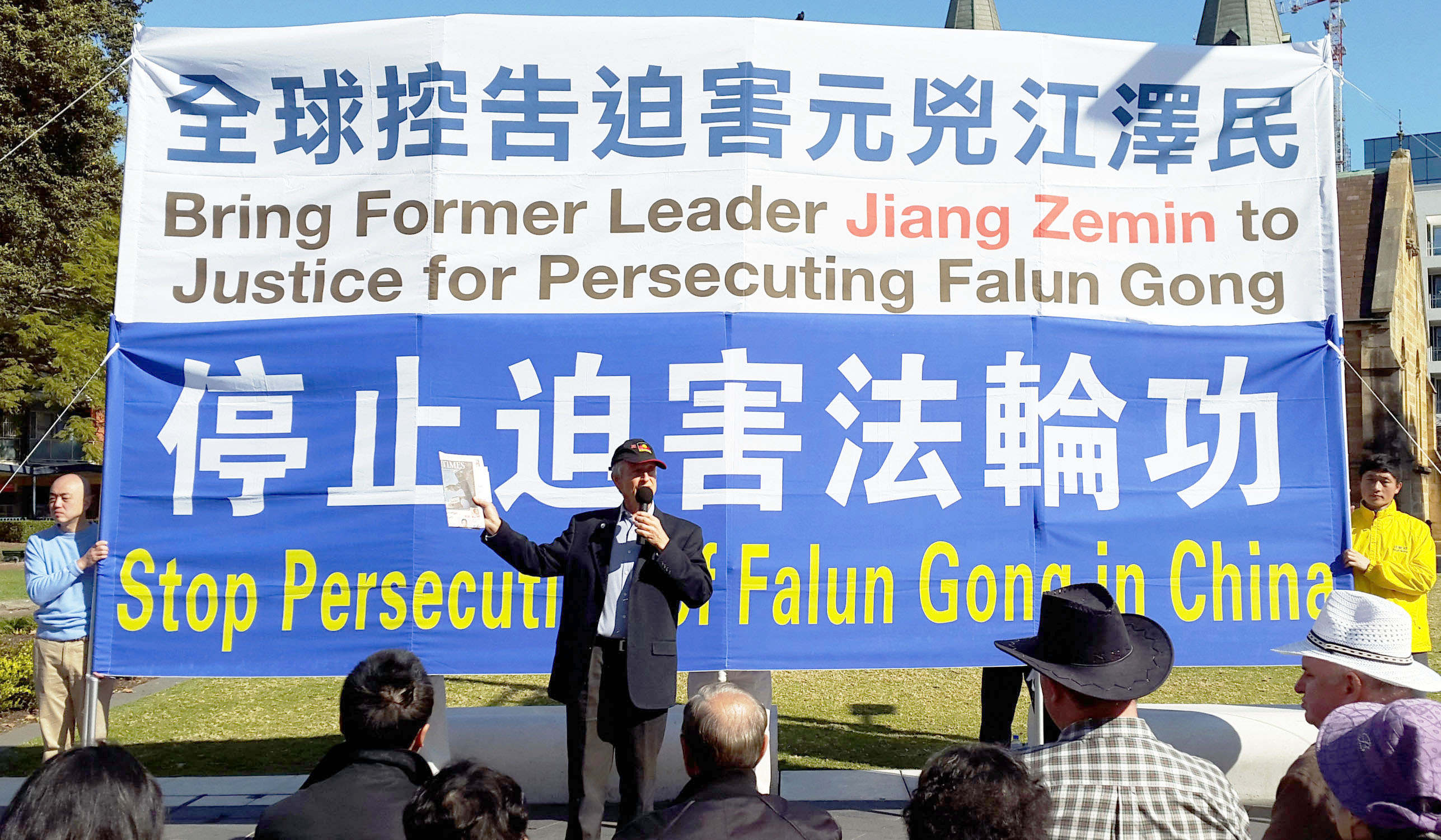 市议员胡煜明(Councillor John Hugh,Parramatta City Council)先生在集会上发言表示:我和帕拉马塔市另两位市议员来这里支持人类基本人权和信仰自由,因为全世界每个人都应该享有这个普世原则。尽管有人认为我们是在反对中国政府,但是我认为在这里谴责反人类罪行,不是在反中国政府。任何人犯了如此之罪,必须受到法律制裁,包括前中共领导人江泽民,没有人可以逾越法律,在法律面前,人人应该是平等的。