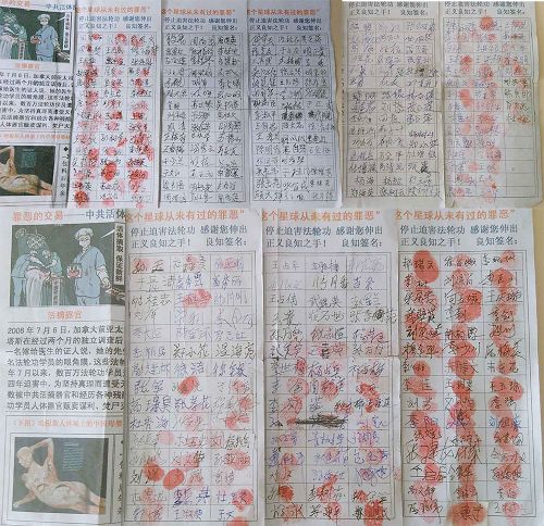一个老乡说:“江泽民上台就没干好事,太坏、太不象话了。为了声张正义,我签名。”他把自己的名字签上,并按上了红手印。一厨师说:江泽民太没人性,他早就该遭恶报了,他祸国殃民、坏透了。