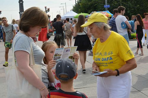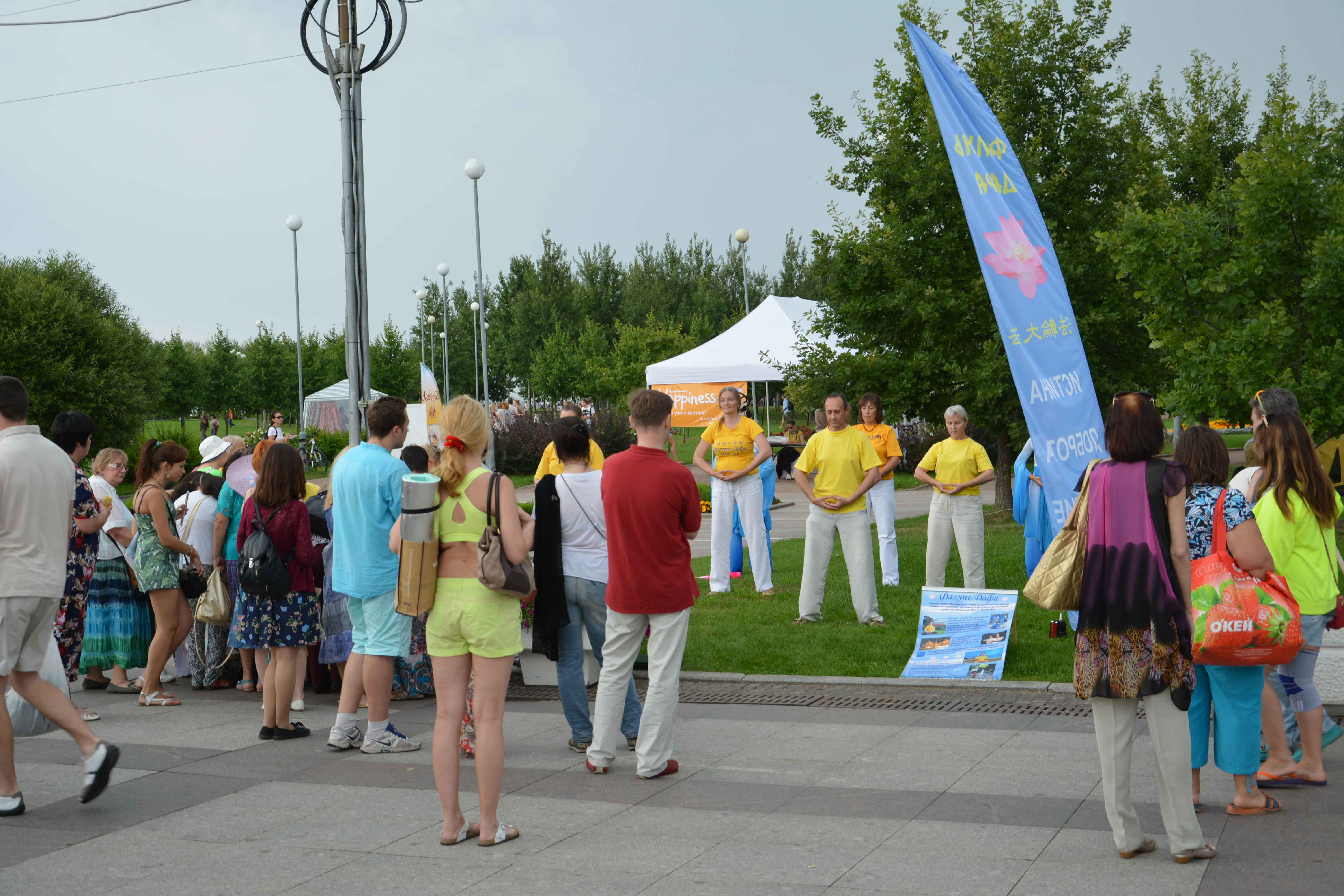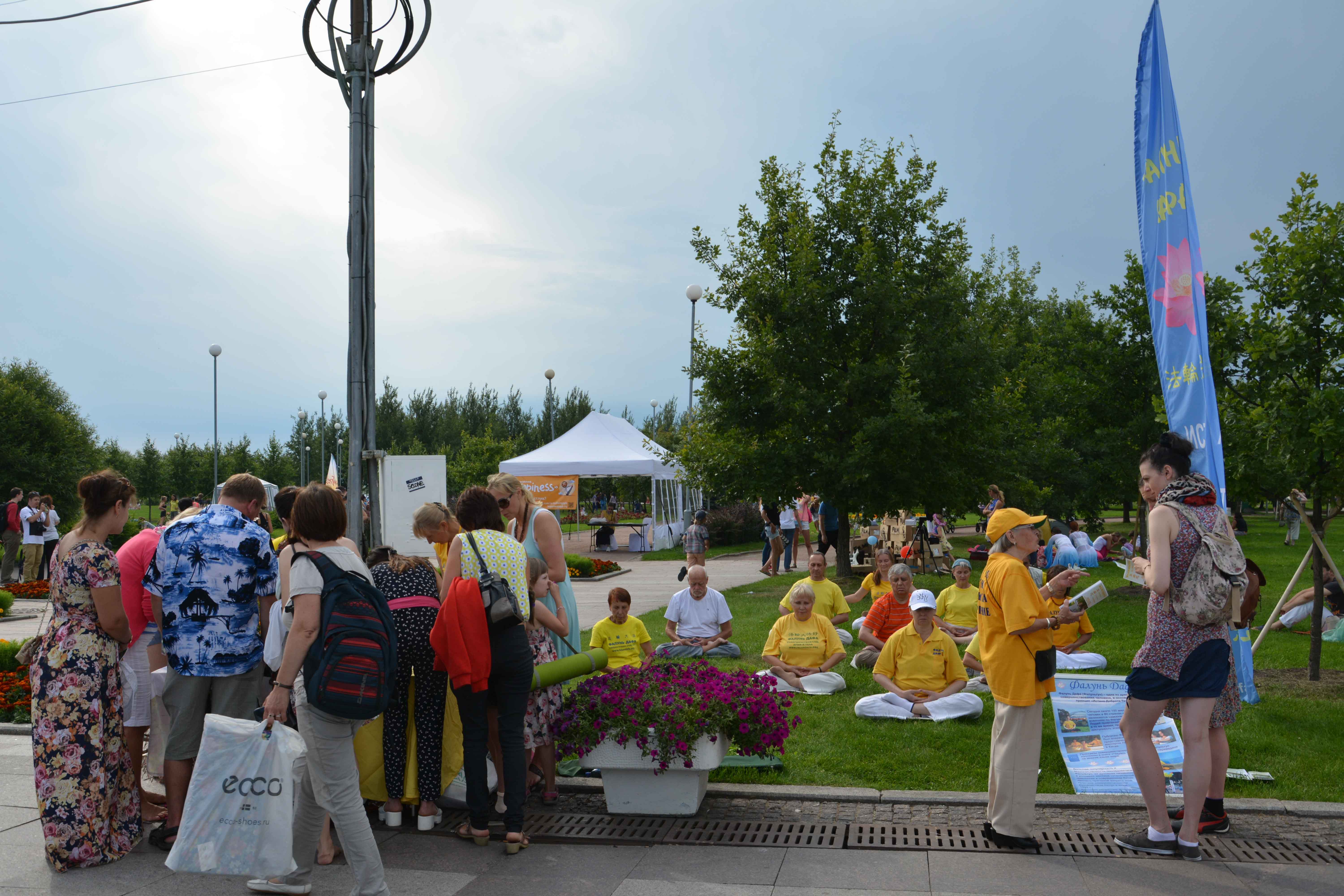 听到和看到优美、舒缓的炼功音乐伴随下的炼功场面,人们纷纷驻足观看,并了解什么是法轮功,有的还当场学功。并还有民众说,自己是专程赶来了解、学习法轮功功法的,因为他们已经听说过这个功法。“圣彼得堡”电视台拍摄了法轮功学员功法演示的镜头并在当天晚上播出。