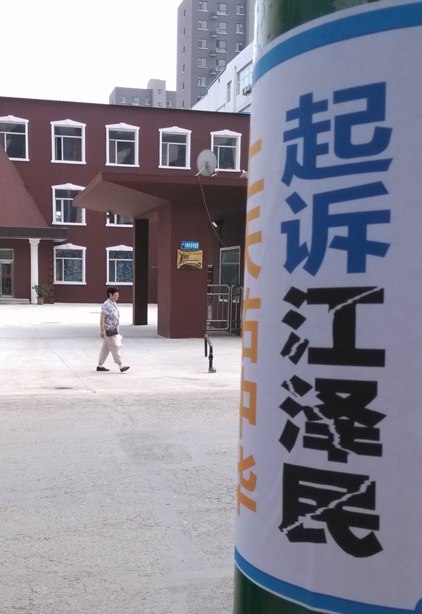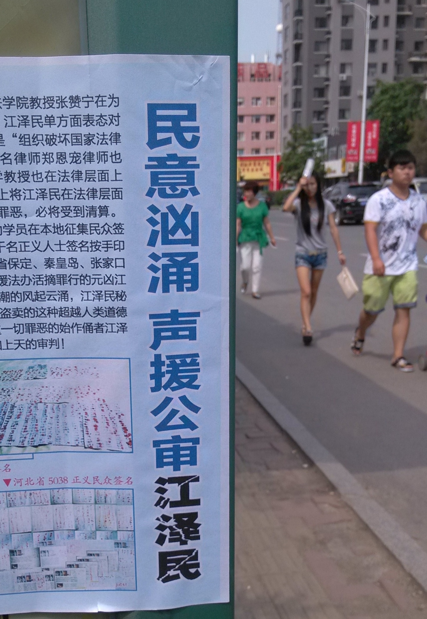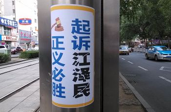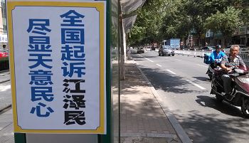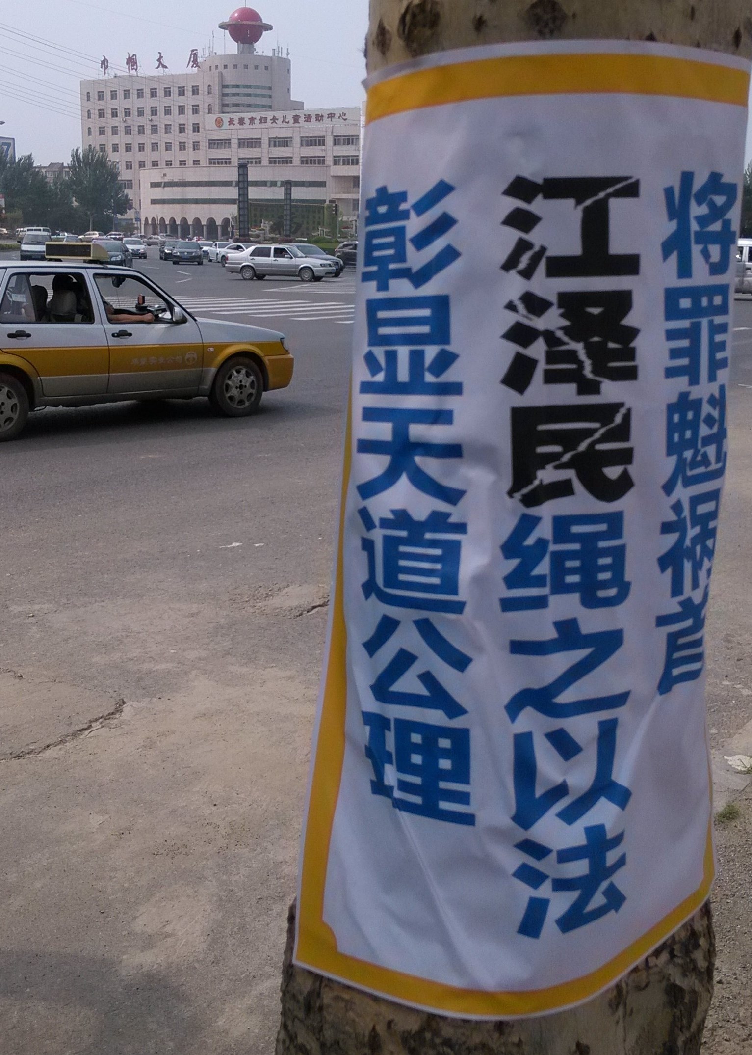 标语上书写着:“法轮大法好”,“真、善、忍好”,“10万人在中国起诉江泽民”,“起诉江泽民还人间正道”,“审判江泽民还法轮功清白”,“停止迫害法轮功把江泽民送上法庭”,“全民起诉江泽民停止迫害法轮功”,“全国起诉江泽民尽显天意民心”,“海内外纷纷起诉江泽民结束迫害法轮功”,“起诉江泽民上天佑中华”。