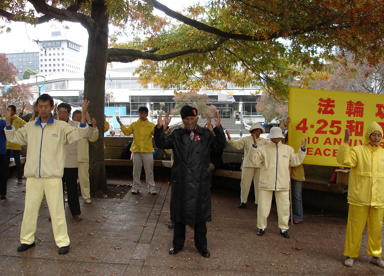 ![]() 二零零七年Amato酋长在奥克兰市中心的Aotea广场与法轮功学员一起炼功。 |
