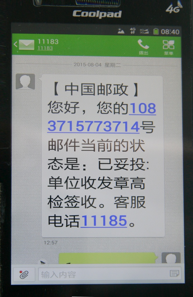 ![]() 吴钦钗收到EMS高检妥投短信 |