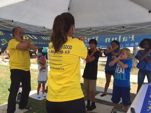 参加此次盛会的有市议会成员、克莱尔蒙特镇议会、体育联赛组织、古董汽车等一百多个展位。法轮功学员的展位迎来了一拨又一拨有缘人。学员们向社区民众演示并教授功法,并向民众分发有关中共迫害法轮功的真相资料。人们纷纷签名支持美国国会谴责中共活摘法轮功学员器官的343决议。