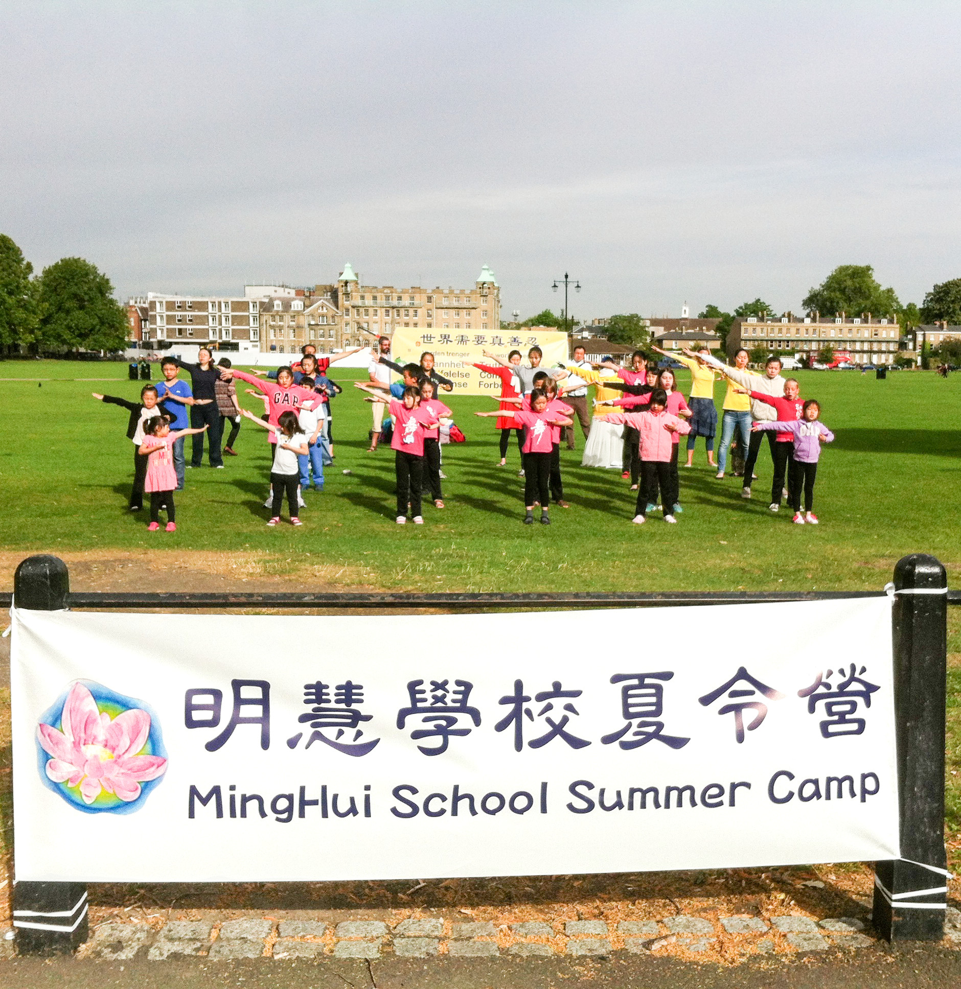 ![]() 英国明慧学校夏令营的孩子们集体炼功 |
