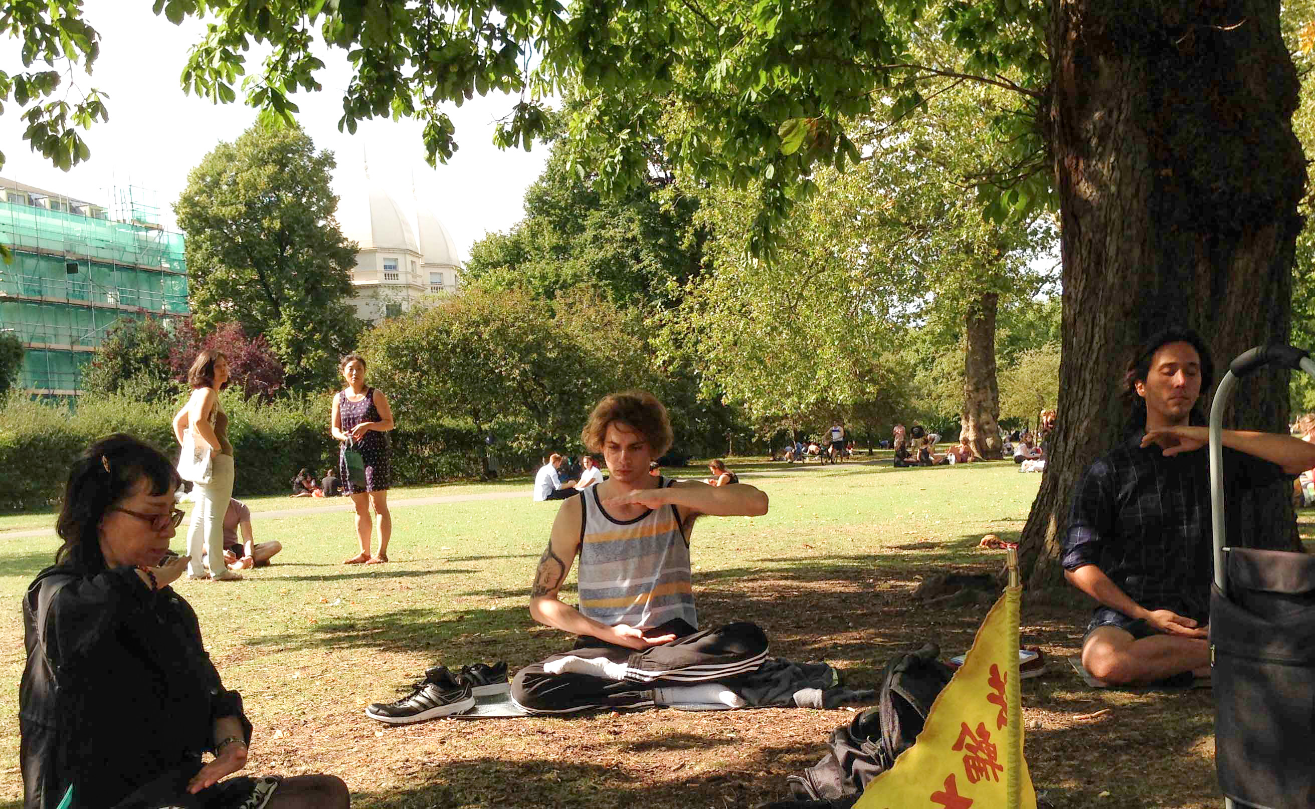 二零一五年八月二十二日下午一点五十分,麦克,一位二十一岁的意大利青年找到了位于伦敦摄政公园的法轮功炼功点,看到了负责义务教功的英国法轮功学员托尼。