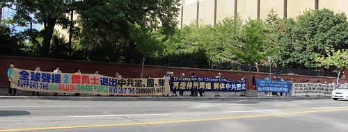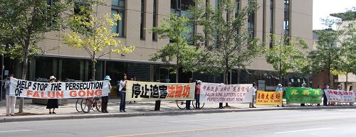 ![]() 多伦多法轮功学员用各种诉江横幅筑起了“真相长城”,让更多路人了解真相。 |