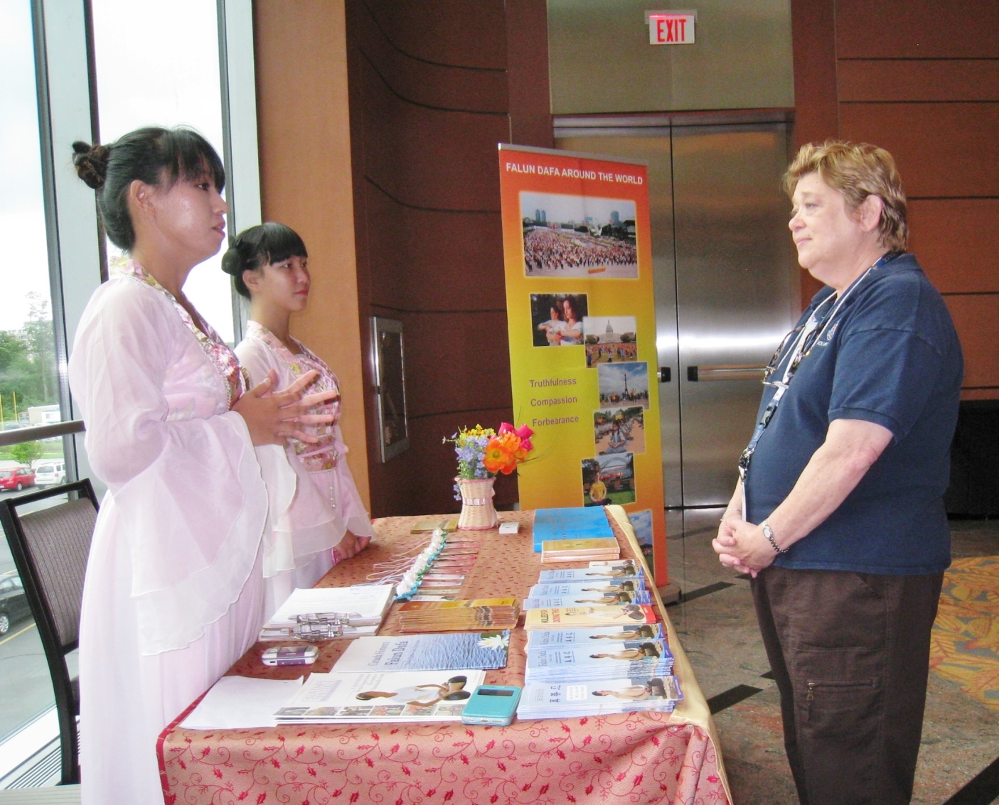 一位在现场工作的女士,在展位处听完介绍之后,对法轮功的神奇功效深感震撼,她说:“你们应该去联系医学院,到那里给学生去办讲座。”并给法轮功学员提供了一个医学院的名字,说那里很注重对打坐的研究。这位女士拿了一些法轮功介绍资料,表示回去后会好好看看。