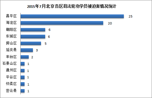 七月,北京当局绑架最严重的区县依次是昌平区25人,海淀区20人,朝阳、东城各6人,房山区5人,延庆县3人,丰台区2人,石景山区、通州区、平谷区、怀柔区、密云县各1人。