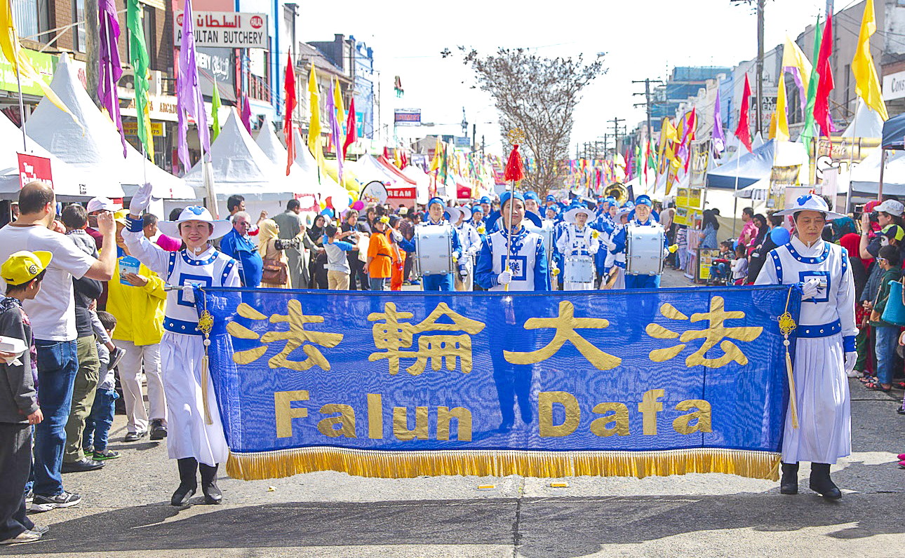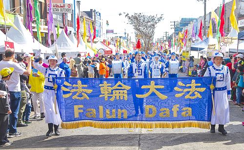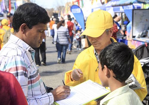 庆典大游行中,雄壮威武的天国乐团是此次游行队伍中最壮观庞大的队伍,他们所到之处受到当地民众热烈的欢迎,市民们兴高采烈地向天国乐团队伍挥手鼓掌和欢呼,很多人拿起相机拍摄法轮大法的游行队伍。当法轮大法的游行队伍走过主席台时,主持人为观众介绍法轮大法是一个信仰“真善忍”的团体,法轮大法源自古老的中国传统功法,使修炼者身心健康,已经弘传世界一百多个国家。听到这些介绍民众更加希望了解更多法轮大法的真相,所以很多人都来向法轮功学员拿真相资料,了解法轮功真相后的民众纷纷签名制止中共非法迫害法轮功。