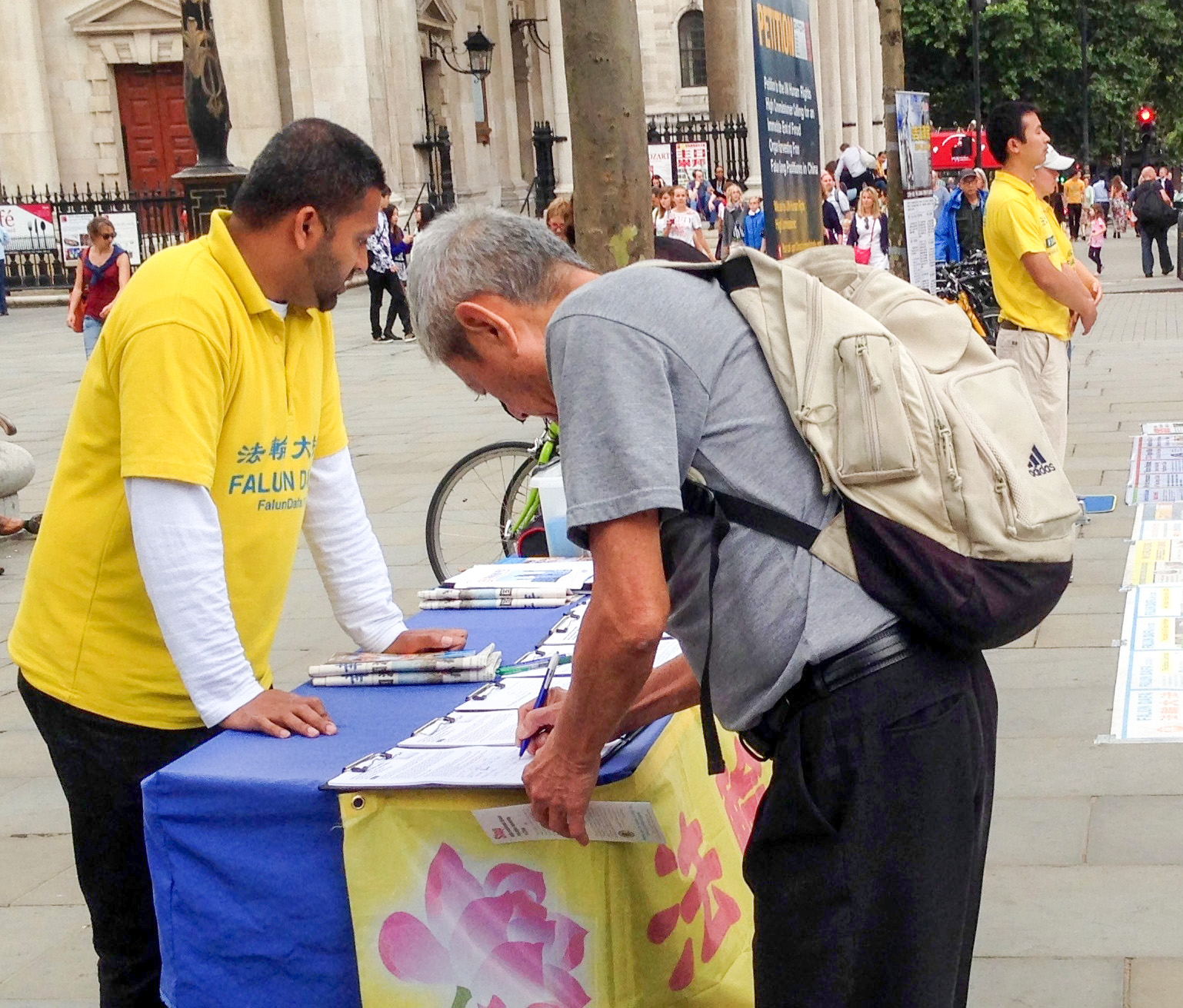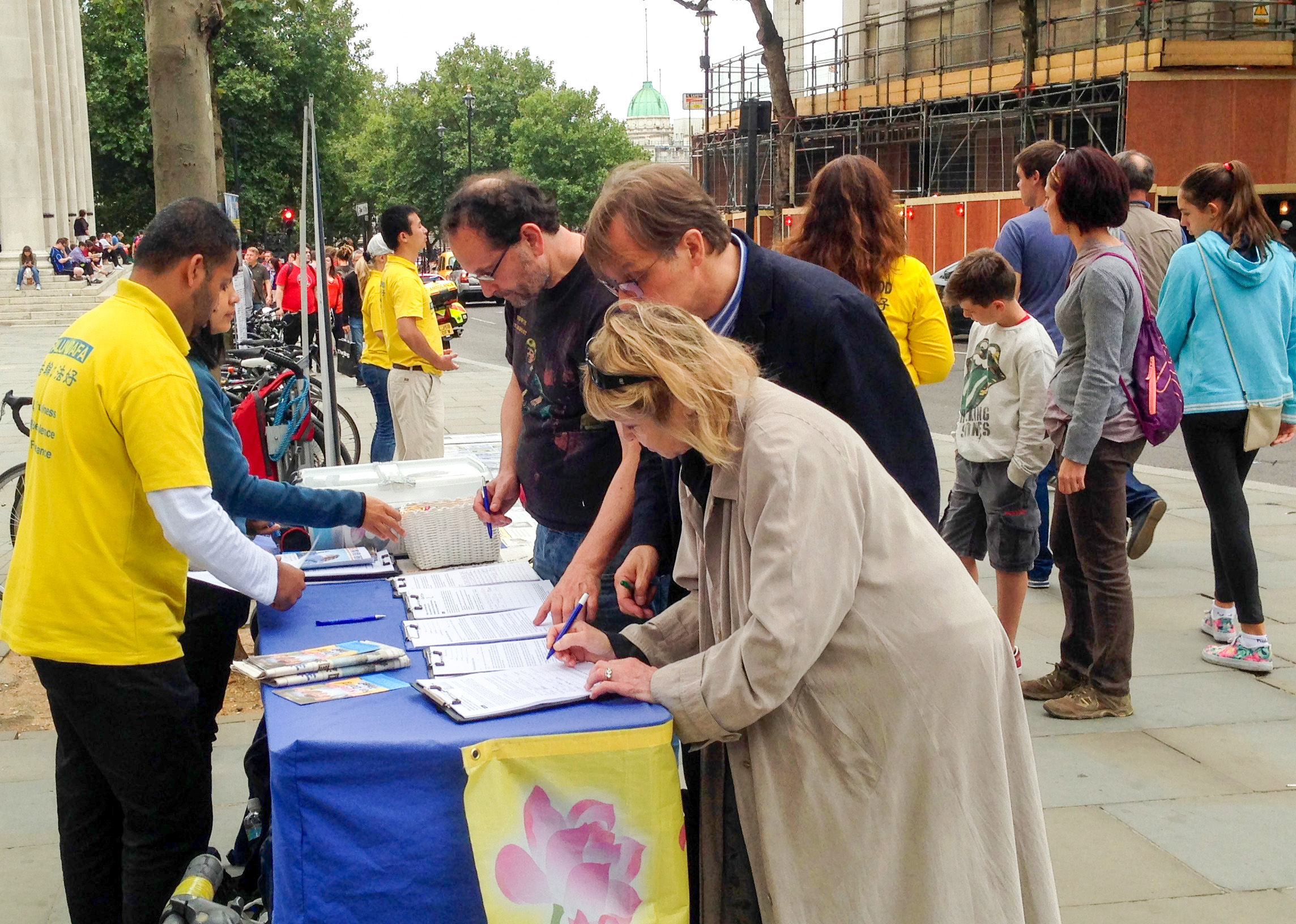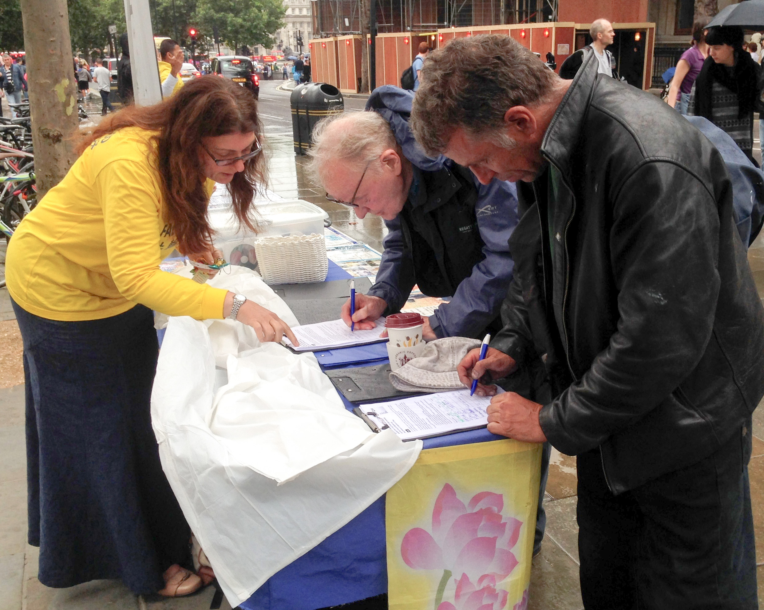 ![]() 伦敦作家克瑞丝蒂娜和丈夫彼得与他们的画家朋友罗伯特路过圣马丁广场时主动签名反迫害。 |