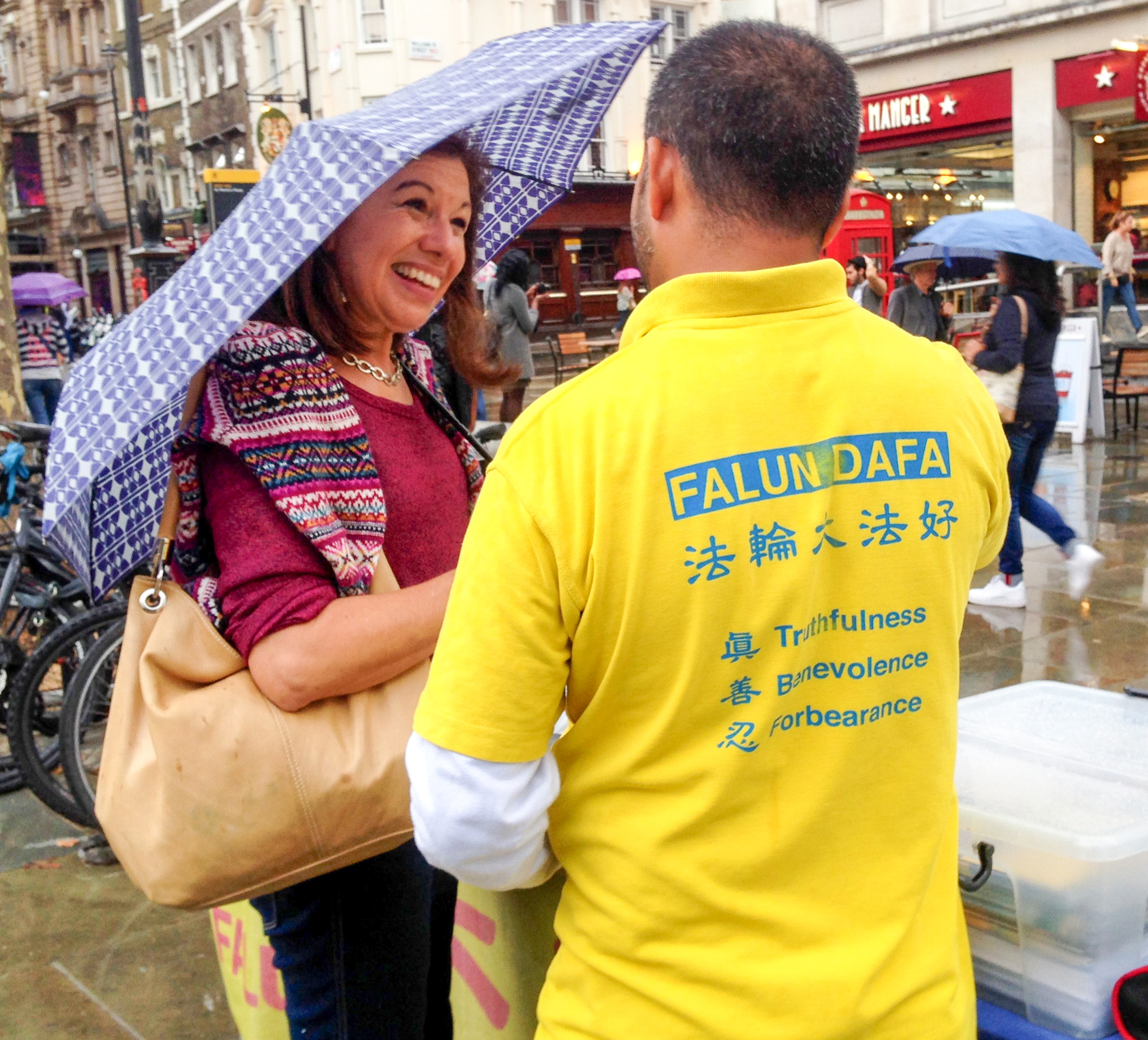一位西人女士来到真相信息台前要求在法轮功反迫害征签表上签名,并接着询问如何学炼法轮功功法。她是来自墨西哥的罗丝(Rose),没想到自己在伦敦市中心的大街上遇到了法轮功学员,她用不太流利的英语兴奋地讲述了自己和法轮功的缘分。