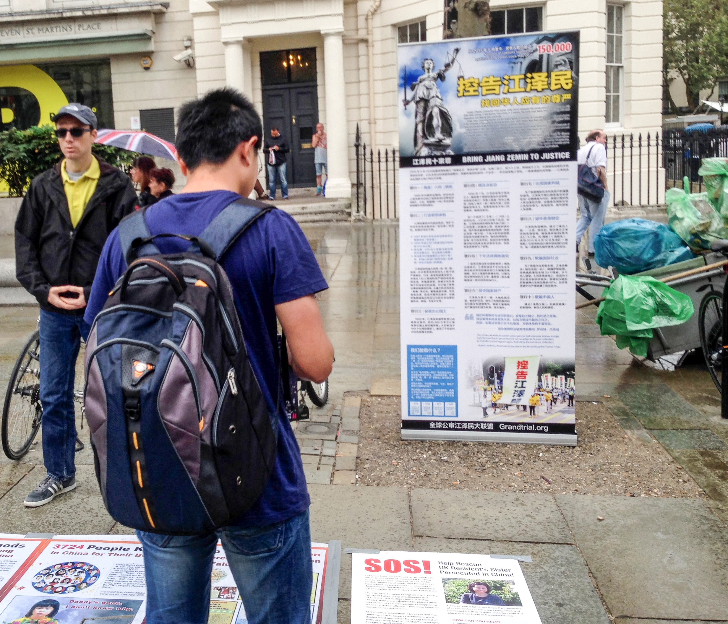 法轮功学员注意到一个中国大陆留学生在经过圣马丁广场时,立即被立在活动场地一端的“控告江泽民(Bring Jiang Zemin to Justice)”展板吸引住了,驻足看了一会儿后匆匆离去,没有停下继续阅读其它信息。大约一个小时左右,法轮功学员发现这位男青年又经过圣马丁广场,一边走一边看摆在地上的真相展板,到了“控告江泽民(Bring Jiang Zemin to Justice)”的展板前驻足阅读后才离开。