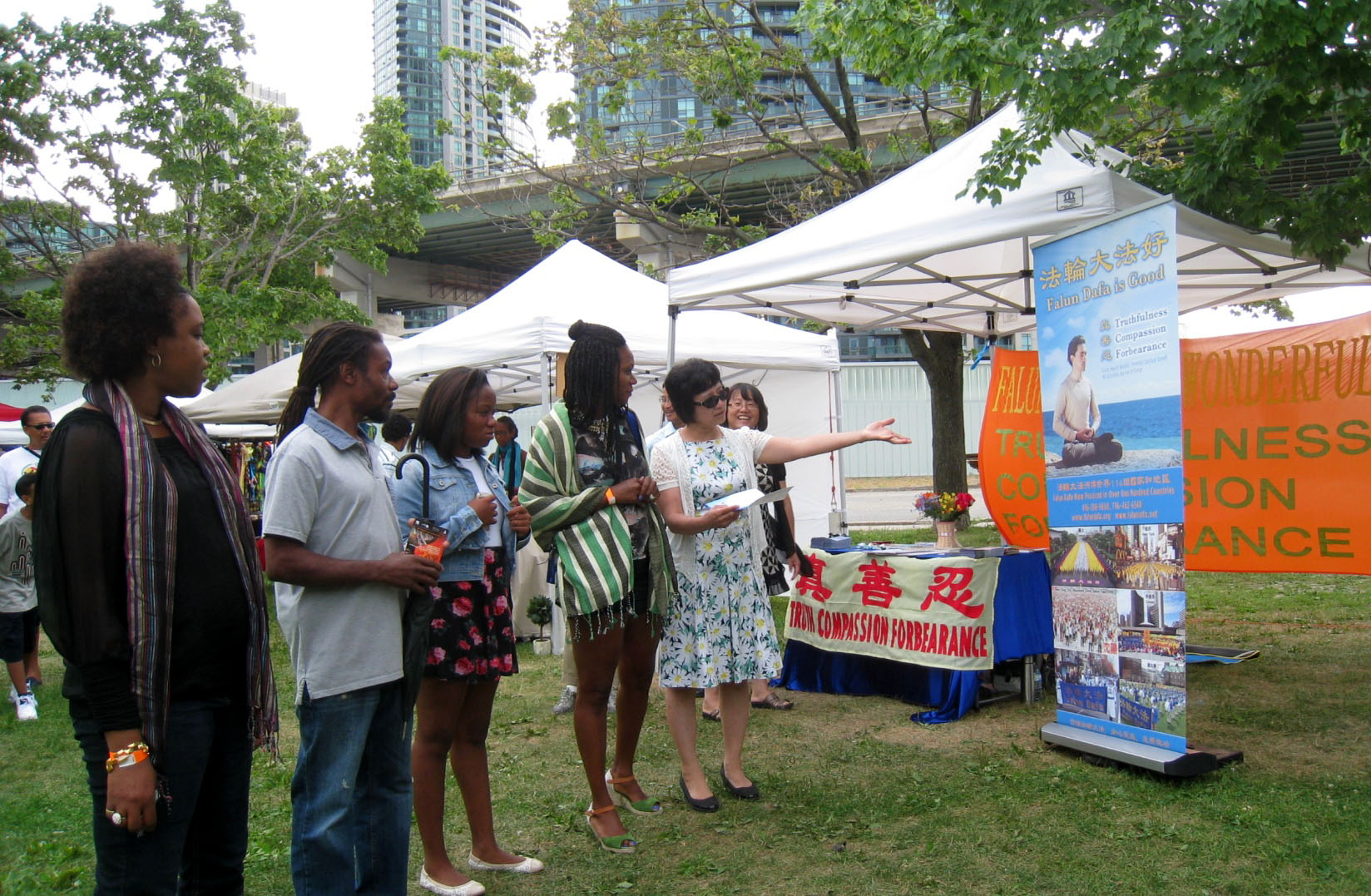 ![]() 图1:法轮功学员应邀参加多伦多IRIE音乐节,许多游客在法轮大法展位前驻足了解真相。 |