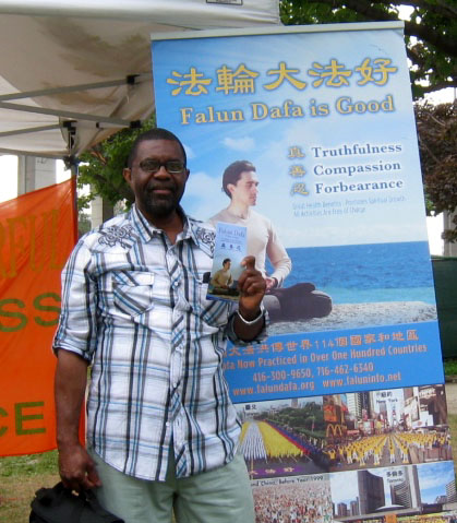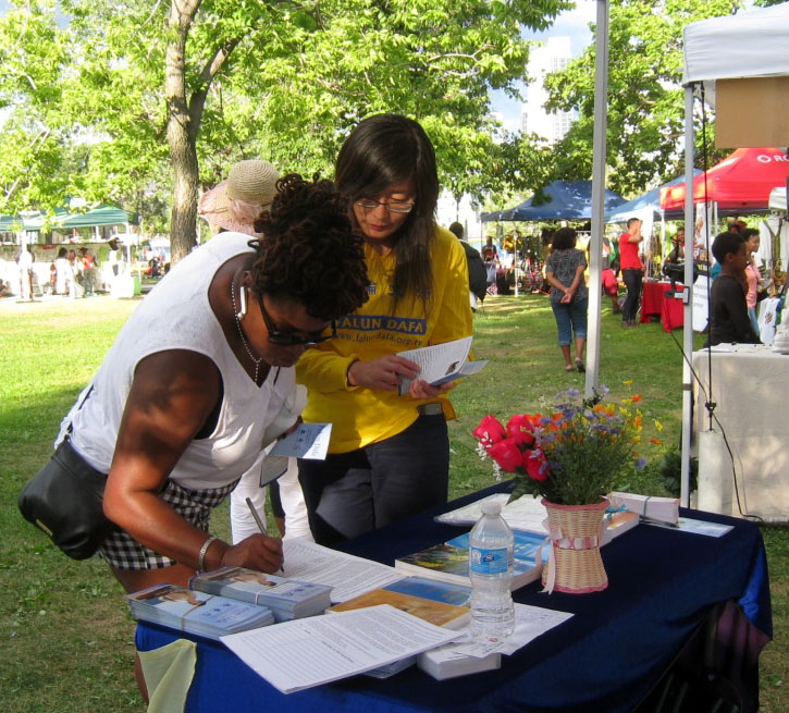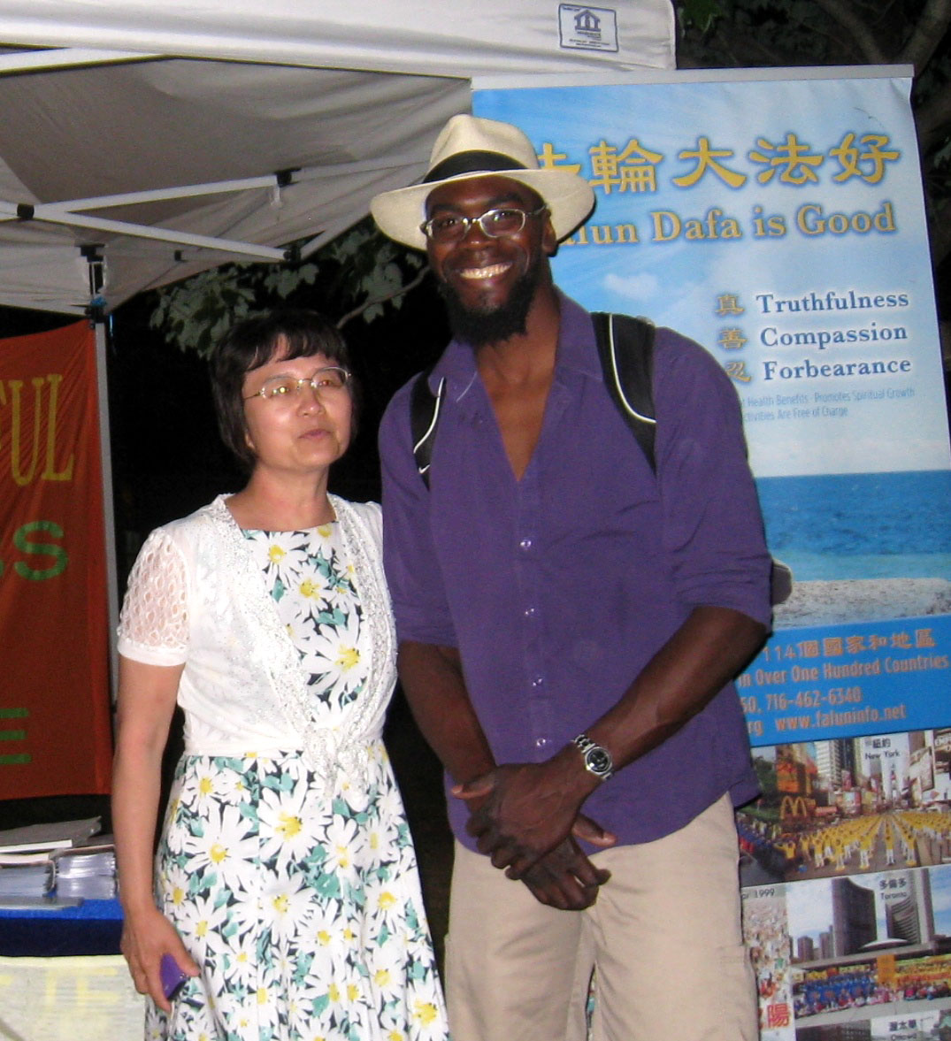 第一天活动夜幕降临的时候,一位在多伦多市读书的黑人大学生克里斯托弗•门罗(Christopher Munroe)走到展位前,饶有兴趣地听完法轮功学员的讲解后,当即决定买法轮功的主要著作——《转法轮》。当听到法轮功学员告诉说要爱护这本宝书,读书前要洗手后,门罗赶快从背包中拿出一件衣服,小心翼翼地把宝书包好并加套了袋子后才放到包内。他说:“你们做了一件非常棒的事情,我也想加入你们的行列。”并说:“下一次活动你们将看到一个黑人会加入到你们的队伍中来!”