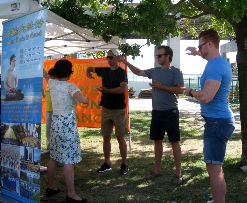 克莱尔•布雷斯韦特(Claire Braithwaite)女士来自于纽约,在法轮大法展位处听说这个功法对身体健康非常有益后,就跟法轮功学员认真地学起了功法。由于湖边蚊虫较多,布雷斯韦特原本打算学完第二套功法就不学了,可是炼完第二套功法后,布雷斯韦特女士好像忘记了蚊虫的叮咬,又接着学起了第三和第四套功法。当被问及学炼功法的感受时,布雷斯韦特女士说:“我爱法轮功!我觉得身体非常轻松,全身血液流动非常顺畅。”布雷斯韦特女士并表示,回纽约后会跟那里的法轮功学员联系继续学习和交流,并要告诉她的同事也来学这个功法。