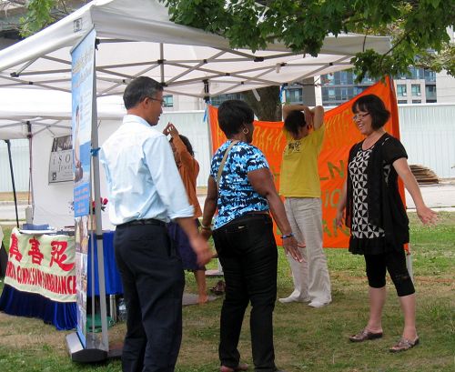 IRIE音乐节旨在庆祝非洲裔加拿大人文化,今年是第十三届,在紧挨着安大略湖湖边的一个花园举行。在举行庆祝活动的这两天,气候一改连日来的高温闷热而变得凉爽宜人,很多音乐家和音乐爱好人士都前来参加了此次庆祝活动,法轮功学员的展位前游人络绎不绝,有时还出现排长队了解法轮功真相的场景。