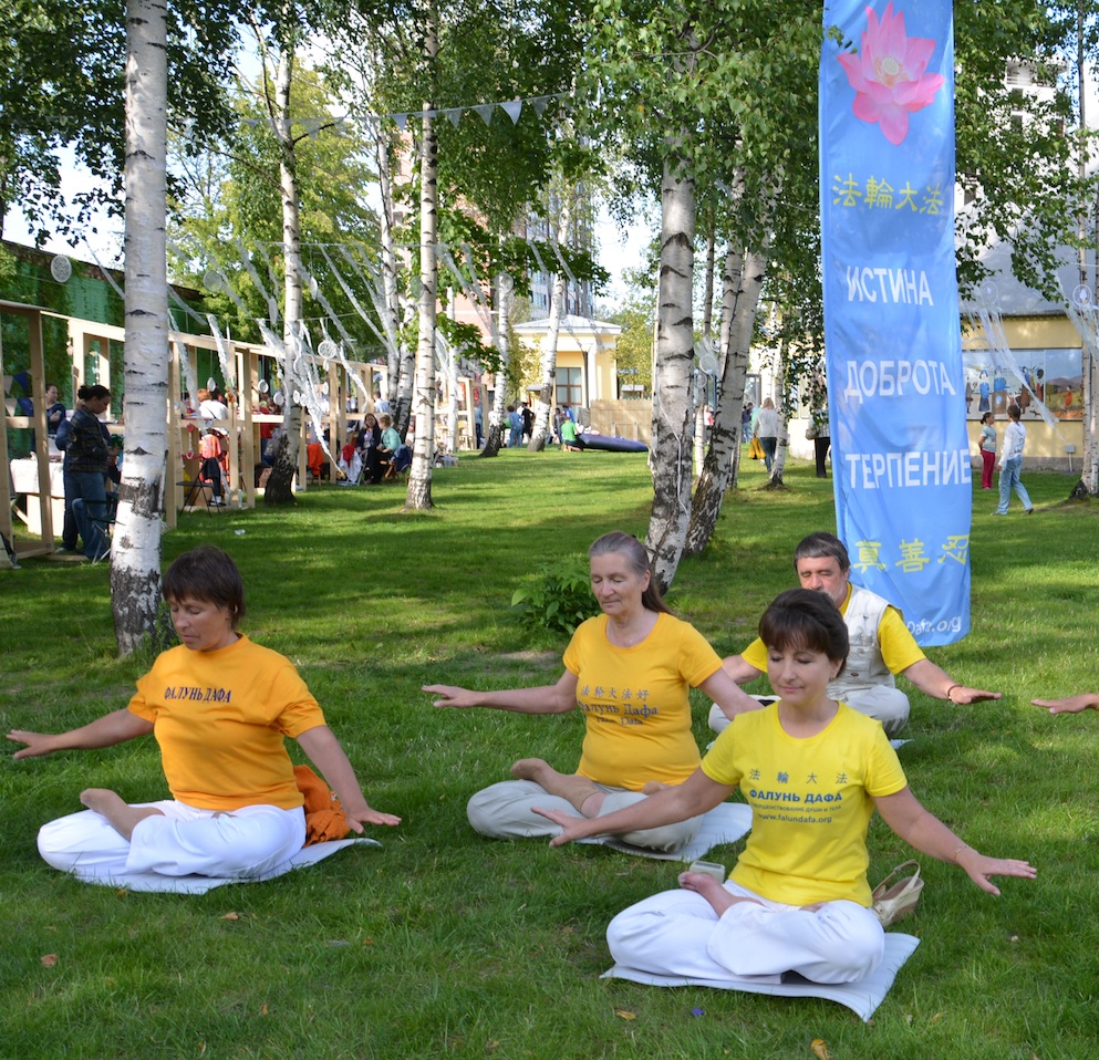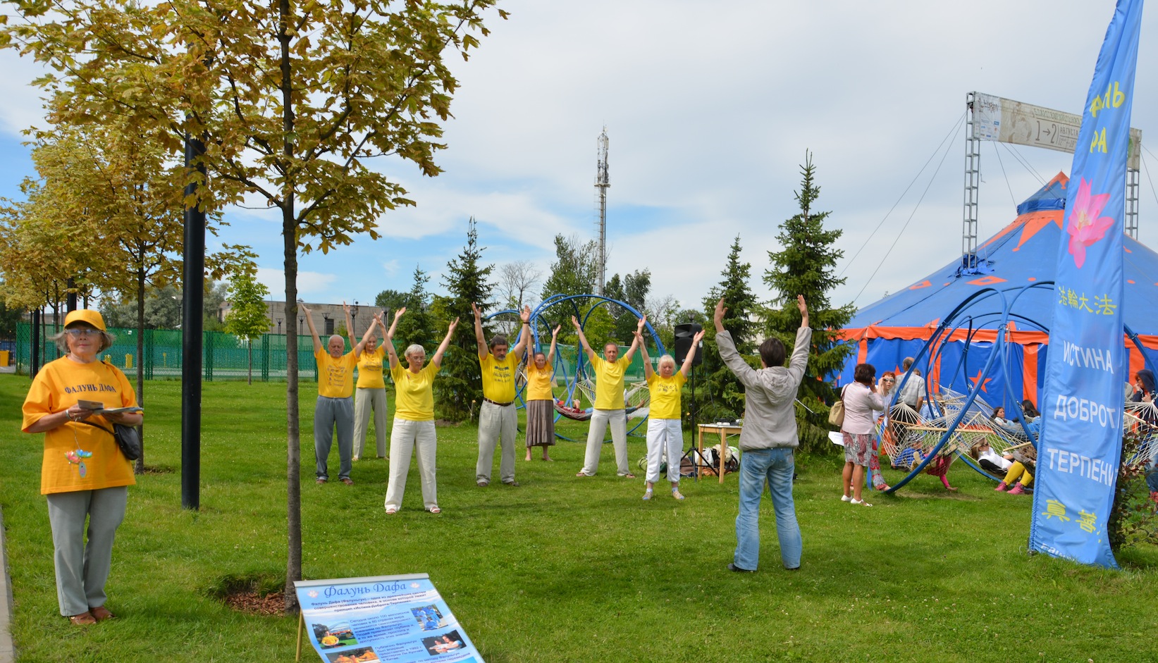 法轮功学员在这两天的时间里向许多来宾介绍了功法,他们还摆出信息展板、印有“真、善、忍”的横幅,教孩子们折叠纸莲花,在公园最繁华的地段炼功并讲解。