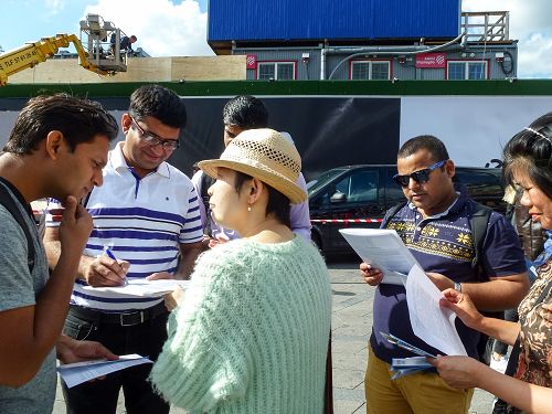 两位欧洲中年女士签名后,还领来两位同事,她们来到征签桌前马上就签名。她们在国际组织“医生反对强摘器官”(DAFOH)的表上也郑重签下名。签名后,她们还询问:“我们还能帮助什么?”学员告诉她们:“把这个真相告诉你们的亲戚朋友,告诉更多的人,你们就是在帮助我们,支持正义,制止罪恶。”