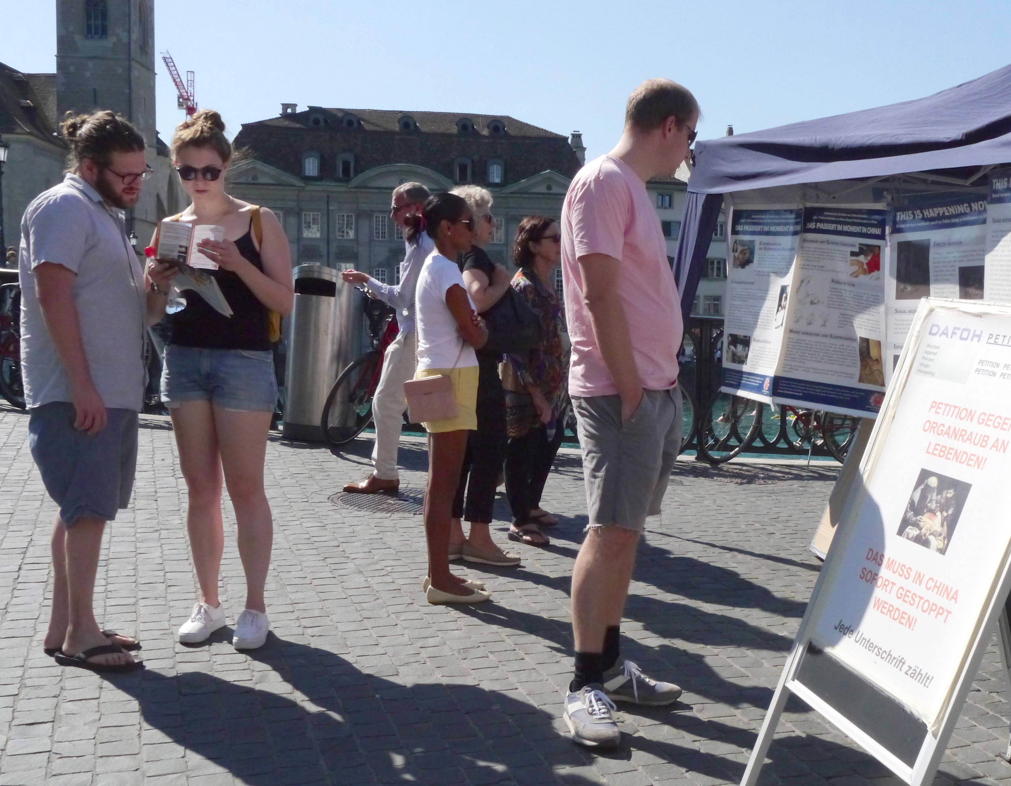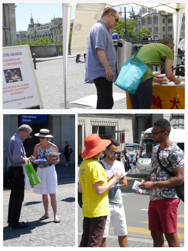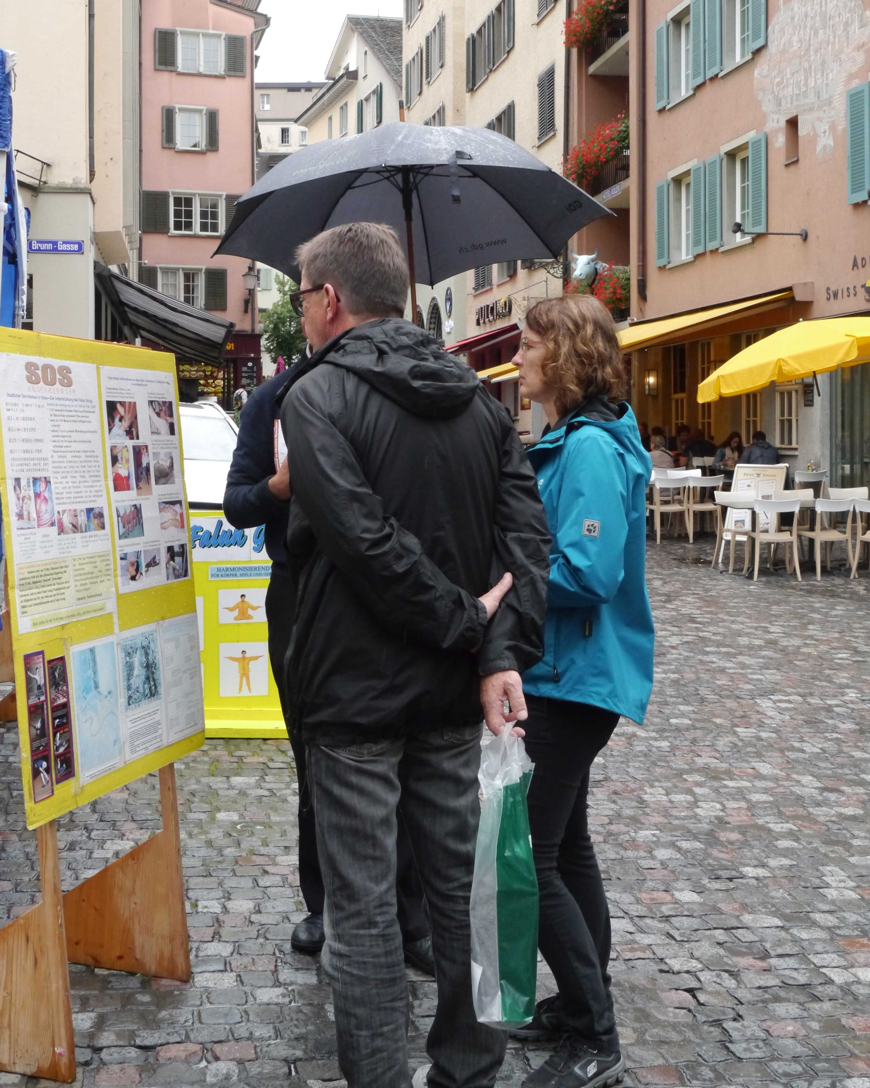 二零一五年八月二十二日,维贝尔女士被两位在喧闹的苏黎世利马特河畔静静演示法轮功功法的女士吸引,她惊讶于她们的专注。在看到法轮功学员被中共种种酷刑折磨的照片后,她希望自己也能为制止迫害出一些力。在过去的两个多月里,法轮功学员在苏黎世的老城区希尔申广场(Hirschenplatz)和旅游景点利马特河畔(Limmatquai)举办了多次信息日活动。很多路人和维贝尔女士一样,签名制止中共活摘法轮功学员器官的罪行。