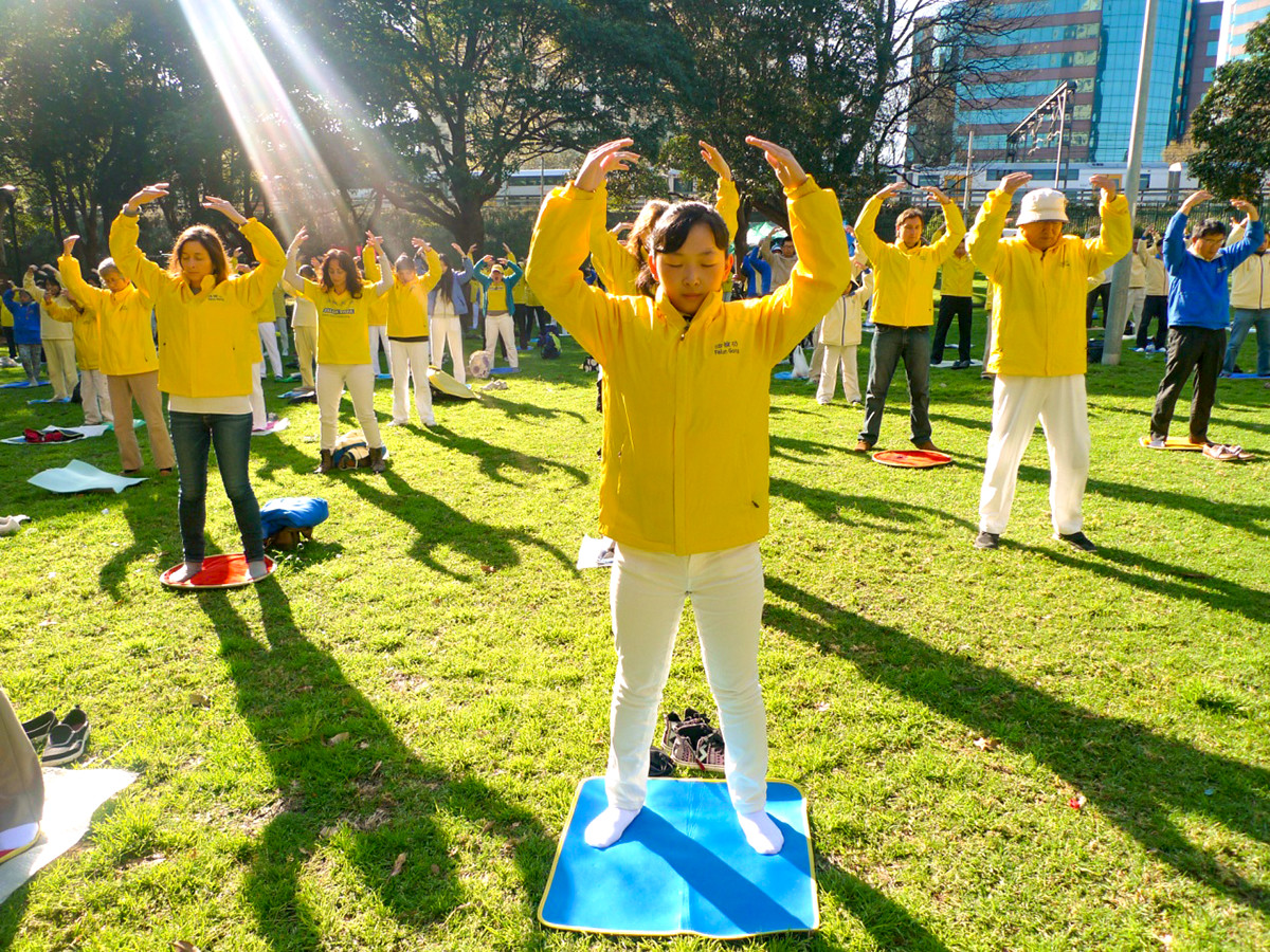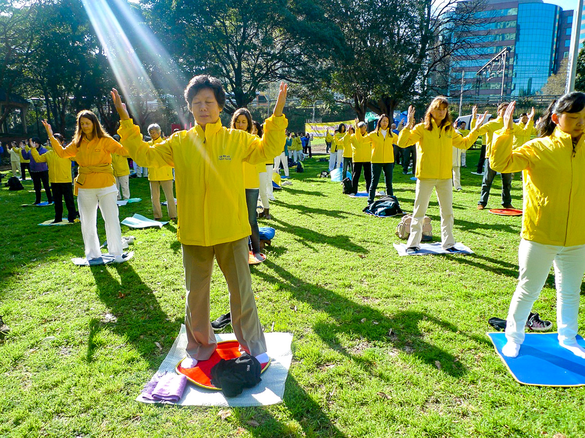 ![]() 图1-4:法轮功学员在悉尼市中心的贝尔莫尔公园(Belmore Park)集体炼功 |